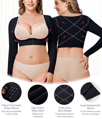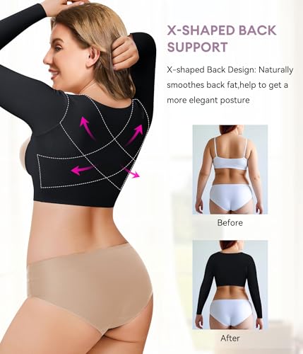 • ENHANCED STYLING COMPRESSION SLEEVE TOPS: Our arm shaper tops' distinctive design that targets both the chest and arms, meticulously sculpting the figure for a flattering look. The U-shaped chest support and long sleeves work together to tone and shape the arms, bidding farewell to any unwanted areas. With a back X design that promotes better posture and a straighter back, Our tops help to achieve a sleek silhouette and an improved body shape.