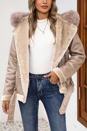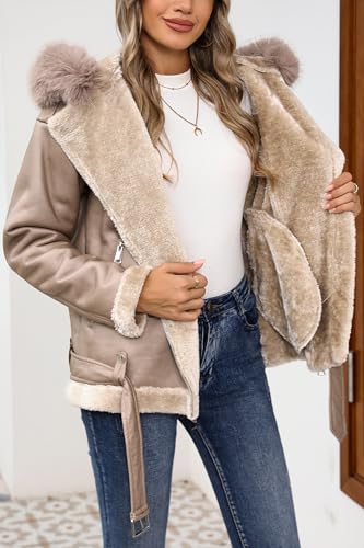 trending ! Bellivera Women Faux Suede Leather Jacket Moto Biker Coat Sherpa-Lined Outerwear with Detachable Belt