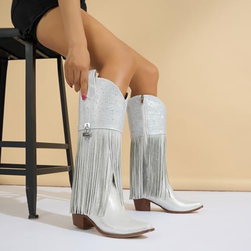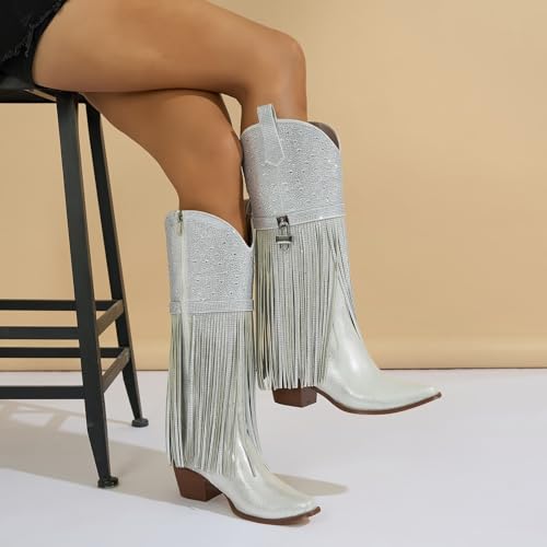Fringe Cowboy Boots for Women, Sparkly Rhinestone Upper Side Zipper cowgirl boots Chunky Heels Pointed Toe knee High Western Boots