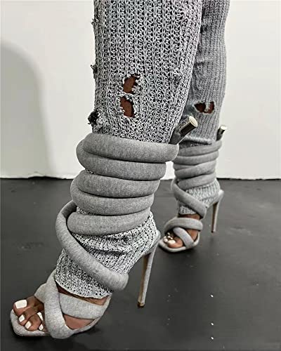perixir Strappy High Heels Gladiator Sandals With Grey Jersey Knit Fallopian Cloth Rope Lace Up Sexy Open Toe Square Stilettos Tie Up Heeled Sandals For Women US Size 6-13