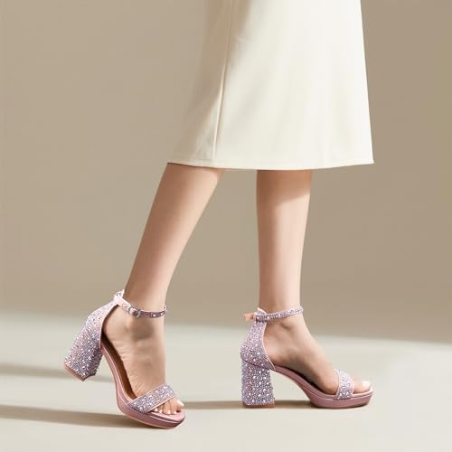 Women's Sparkly Rhinestone Platform Block Heel Sandals Ankle Strap Open Toe Party Wedding Shoes