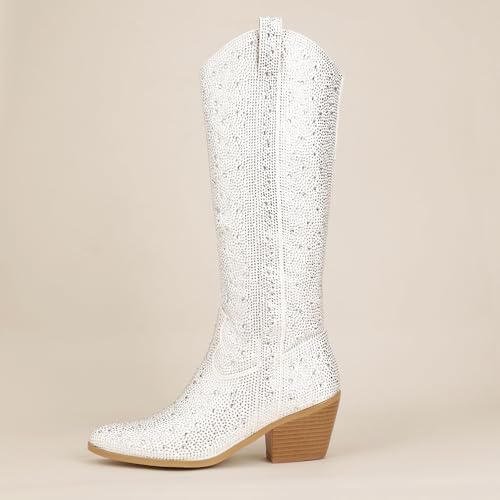 IDIFU IN3 Rhinestone Cowboy Boots For Women Knee High Western Cowgirl Boots Pointed Toe Block Chunky Heels Sparkly Glitter Long Tall Dress Booties Party Bling Shiny Boots