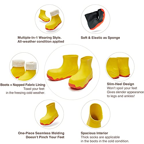 Sole material: RubberOuter material: Ethylene Vinyl Acetate (EVA)Closure type: Pull-OnWater resistance level: WaterproofMultiple-In-1 Wearing Style. All-weather condition applied-Tailored for your everyday use. They can be freely changed as you like! Unleash your creativity, brainstorming their new wear.1-Piece & Seamless Design Keeps Feet Warm and Dry-In cold, rainy, and snowy conditions, the boots without seams can keep your feet toasty. Durable, waterproof & adaptable to a wide range of damp conditionsStylish Streamlined Appearance-Non-bulky design provides sleek and fashionable look.Slim-Heel Design-Won’t spoil your feet. Gives slender appearance to legs and ankles!3D Texture Spanish Navarra Map Built Into The Bottom Of The Sole-Slip-proof rubber sole provides excellent grip, easy to deal with all kinds of slippery conditions: such as snow, mud, puddles and slippery floors. Perfect for everyday use. finest materials and excellent craftsmanship ensure long-lasting durability.