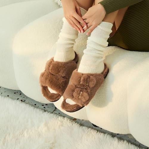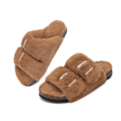 trending ! Rainlin Women's Fuzzy Slippers Comfy Cork Footbed Fluffy Slides Open Toe Indoor Outdoor House Shoes with Arch Support