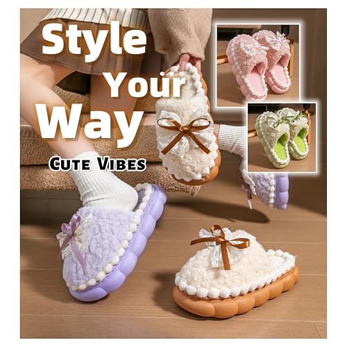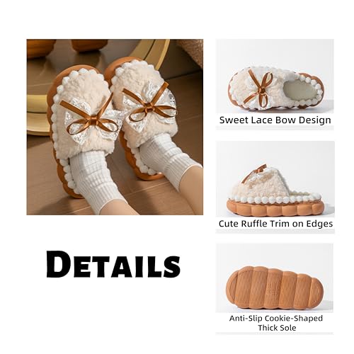Women's Lace Bow Plush Slippers - cozy Fuzzy Lining, Cookie-Shaped Non-Slip Sole for Indoor Comfort