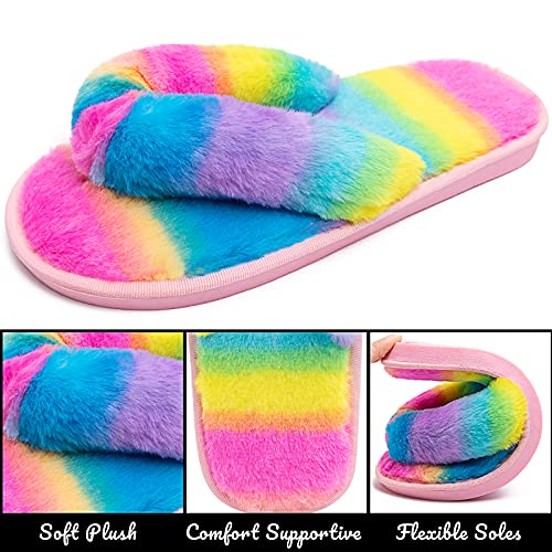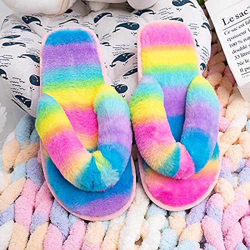 Sole material: FoamOuter material: Faux FurClosure type: Pull-OnFUZZY & FASHION FLIP FLOPS - velvety plush faux fur upper and furry memory foam footbed. Great for girls and ladies who love cozy, elegant, and fuzzy slide sandalsMEMORY FOAM INSOLE - Solid high density memory foam insole gives you enough support and reduce foot stress. Relaxing your foot after a long day of hardworking and providing you the superior comfortabilityMULTI FUNCTION - These open toe slip-on sandals are made for leisure time at home. Great for wearing post-bath or spa, cooking in the kitchen, playing with your kids, drinking afternoon tea in the garden, walking to the mailbox, taking out the trash, watering the lawn, walking the dog, or going out to sign for parcelsEASY CARE - Machine wash with a laundry bag or hand wash, easily clean off stains or dirt. Suitable for all seasons. Open toe design for ventilation and breathabilityGREAT GIFT CHOICES - Available in 10 colors, Black, Grey, Blue, Green, Pink, White, Bright Rose Pink,Rainbow, Shiny Rainbow, and Leopard colors. Great gifts for girls and ladies. Also perfect for bride, travel and holiday wear Perfect for everyday use. excellent materials and excellent craftsmanship ensure long-lasting durability.