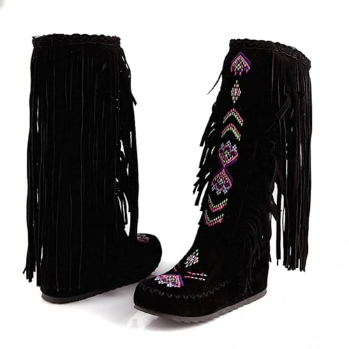 Women's Fringe Western Boots,Suede Embroidered Fringe Mid Calf Knee High Flat Boots Cowboy Tassel Snow Booties