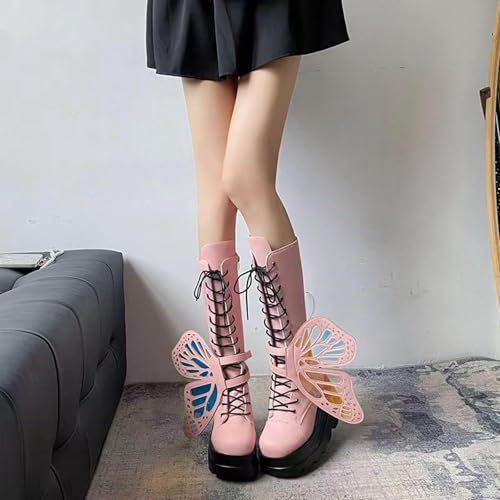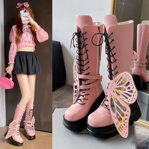 trending ! Women Platform Punk Goth Mid Calf Boots Butterfly Wings Chunky Wedge Heel Knee High Party Boots Motorcycle Combat Booties