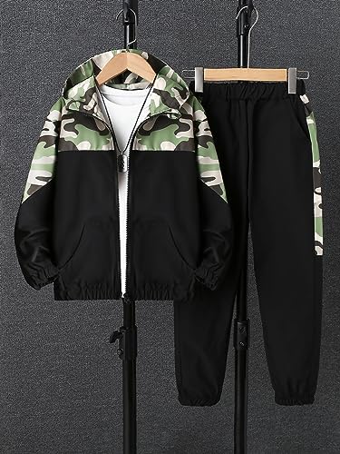 trending ! OYOANGLE Boy's 2 Piece Camo Print Long Sleeve Zipper Hoodie Jacket and Elastic Waist Jogger Pants Set Tracksuit