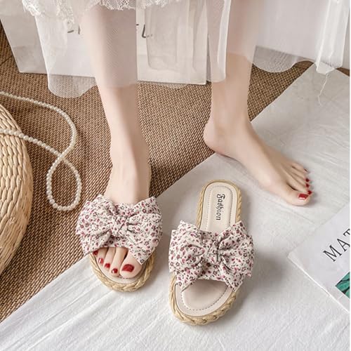 Women's Open Toe Slide Slippers with Cute Bow, Slip-on House Shoes, Summer Linen Slippers with Rubber Sole