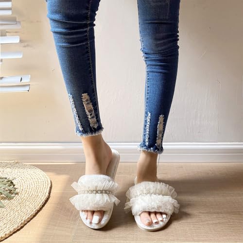 trending ! Women's Fuzzy Slippers, Sparkle Faux Pearl Rhinestone Lace Decor Slippers, Fashion Bling Flat Slip on Sandals, Open Toe Indoor House Slippers, Wedding Slipper for Bride Bridal Shower Wedding Day