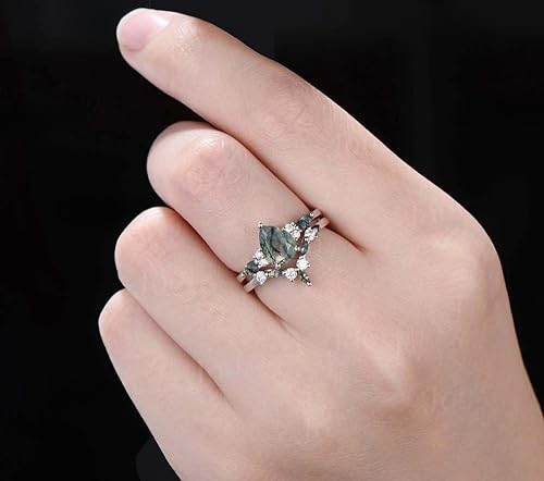 Natural Moss Agate Ring Set 925 Sterling Silver Pear Shape Moss Agate and Moissanite Engagement Ring for Women on the house Engraving