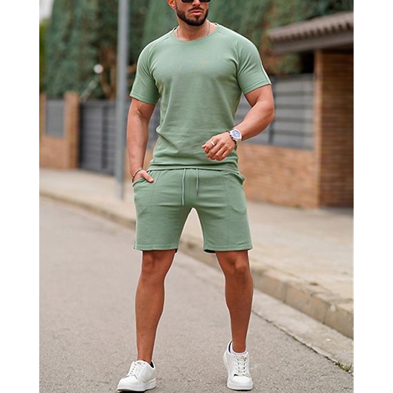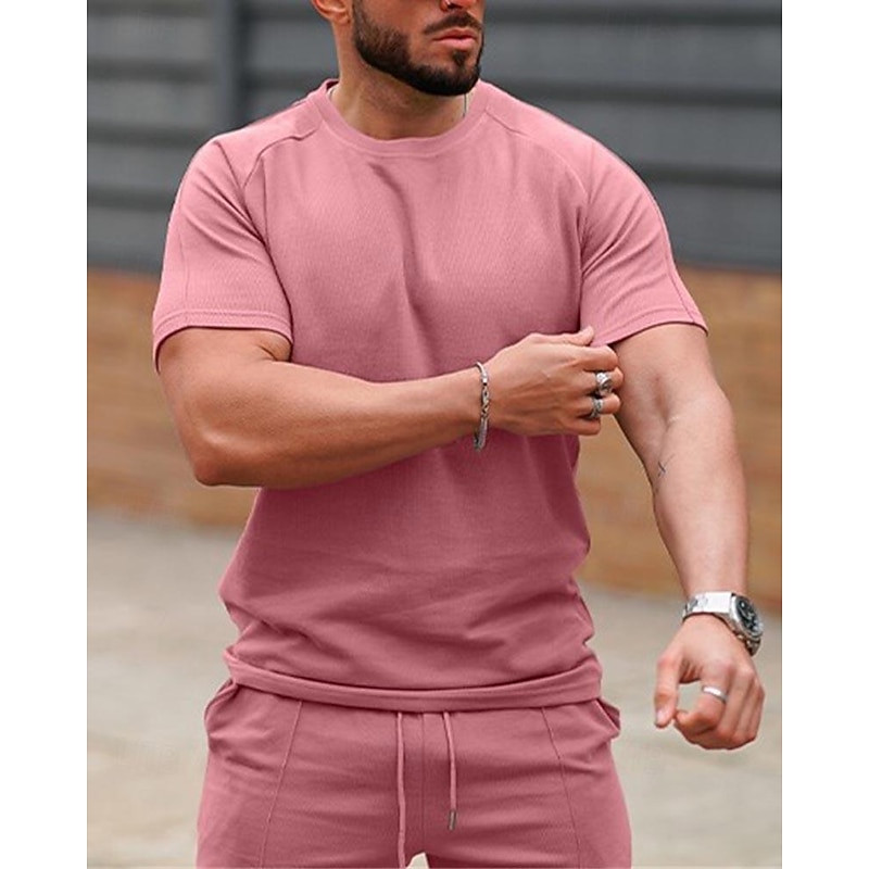 Men's T-shirt Suits 2 Pieces Outfits Tee & Shorts Short Sleeve Crew Neck Summer Plain Fashion Casual 2 Piece Vacation Daily Wear Going out White Pink Green Top Tee for Men