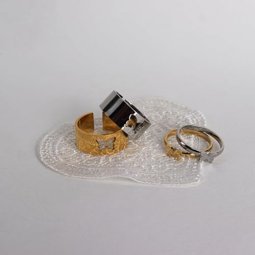 Ring size: AdjustableMaterial: MetalMetal type: Stainless SteelGem type: No GemstoneMinimal silver butterfly matching rings, a couple set of two rings, one bold open cuff with slightly adjustable design, and one dainty band with fixed size, excellent for everyday wearing.Simple statement y2k love heart couple rings, U.S. ring size No. 8, thick band great for thumb ring wearing, thin ring great for layering and stacking, cool and charming, making it a go-to accessory for effortless style.White gold plated stainless steel, fade-resistant, lead free, nickel free, hypoallergenic, adds a touch of glamorous to any outfits.Express your love and appreciation with our gorgeous couple ring set, an ideal gift for best friends, wife, partner, mothers, couples, and daughters, for special days like Birthday, Graduation, Wedding, Anniversary, New Year, Valentine's Day, Mother's Day, Easter, Spring, etc.Love band set jewelry that is truly worth keeping. To maintain its shine and longevity, we recommend proper storage and regular cleaning. Avoid frequent adjustment and hard bending to preserve the ring's integrity. Perfect for everyday use. excellent materials and excellent craftsmanship ensure long-lasting durability.