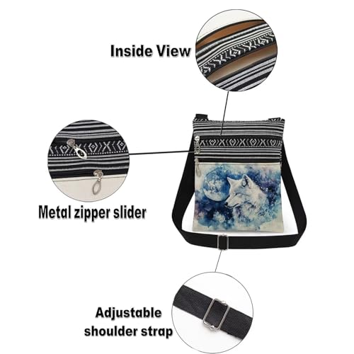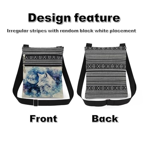 Wolf & Moon Print Men Crossbody Bag Adjustable Unisex Shoulder Bag with Zipper Closure Wilderness Lovers Gift Woman Wolf Lovers Gift Messenger Bags