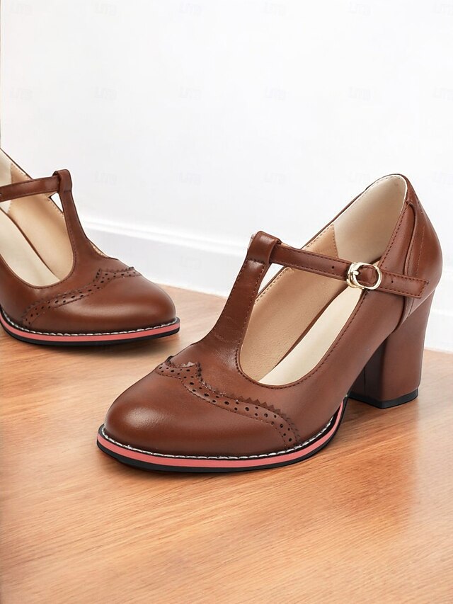 More information about Women's Vintage Brown T-Strap Mary Jane Pumps with Brogue Detailing – Chunky Heels for Office, Retro Fashion, and Casual Events