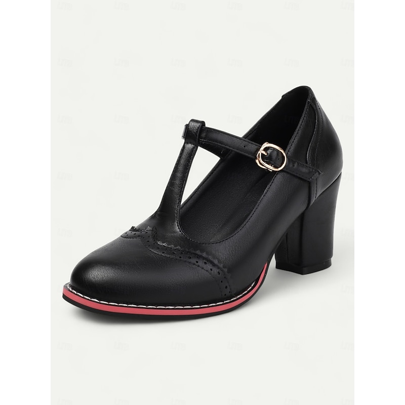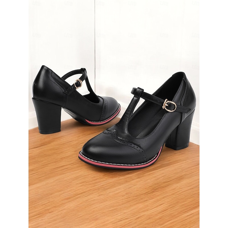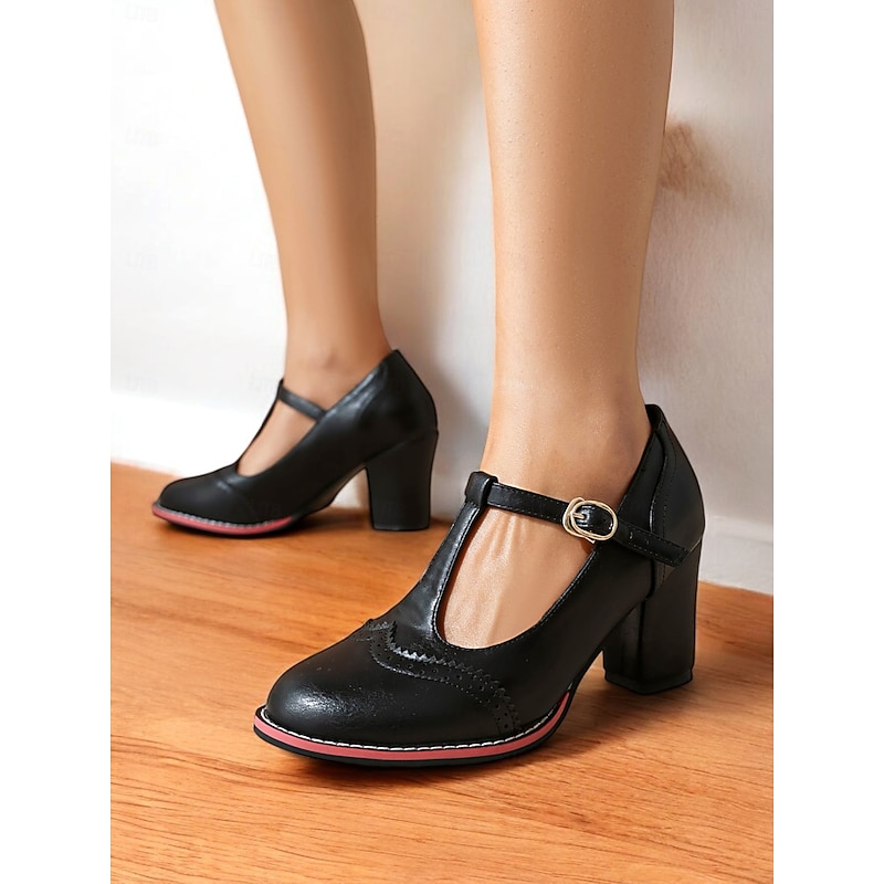 Highlights [Material and Construction] : Crafted from high-quality PU for the upper and lined with synthetic leather, these vintage-themed Mary Jane pumps offer a polished finish and superior longevity. The rubber outsole adds traction and stability, making them ideal for daily wear. [Profile and Comfort] : Featuring a cozy chunky heel, these pumps provide a perfect blend of height and support. The soft, cushioned interior ensures comfort throughout the day, while the rounded toe design enhances the vintage appeal. [Design Highlights] : The pumps stand out with a traditional T-strap buckle embellished design that allows for an adjustable fit, ensuring secure and personalized wear. The intricate brogue detailing enhances the timeless look, making these shoes versatile for different styles. [Occasions] : Whether it's a formal office setting, casual meet-up, or retro-themed event, these pumps are versatile enough to complement various occasions. Suitable for all seasons, they offer an elegant touch to any outfit, from daily work attire to casual ensembles. [Size Range and Fit] : Available in a full range of women's sizes from US5.5 to US10.5, these pumps are designed to fit true to size. Select your usual size for the best fit.