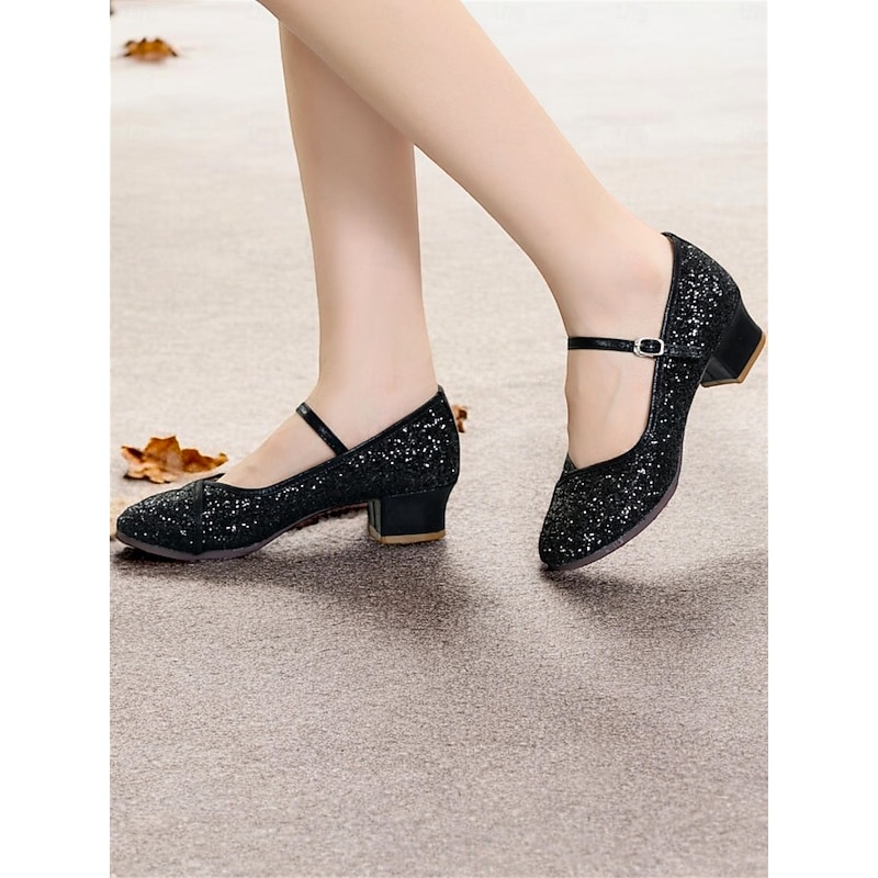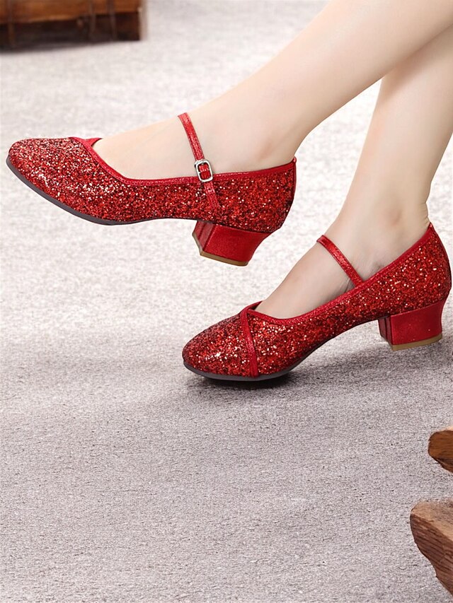 Highlights [Fabric] : Crafted with dazzling sparkling glitter and a high-quality fabric outsole, these dance shoes combine elegance and functionality, ensuring comfort and durability during performances. [Style] : Designed in the classic Mary Jane silhouette, these shoes feature a charming strap across the instep with a delicate buckle, embodying both style and security. The low block heel lends stability, making them suitable for hours of dancing. [Design Highlights] : The shoes showcase a bold sparkle with their shimmering red glitter exterior, perfect for capturing attention. The round-toe design adds a touch of traditional elegance, balancing the boldness of the glitter with classic elements. [Occasions] : Ideal for special events or evening outings, these shoes are perfect for Samba, ChaCha, and Rumba dancing. Whether you’re aiming to make a statement on the dance floor or seeking a comfortable yet contemporary option, these shoes are your go-to choice for any glamorous occasion. [Size Range] : Available in a range of sizes from US5 / EU35 / UK3 to US9 / EU40 / UK7, these shoes are designed to fit a variety of foot sizes, providing a snug and comfortable fit. Select your usual size for the best experience. Perfect for everyday use. excellent materials and excellent craftsmanship ensure long-lasting durability.