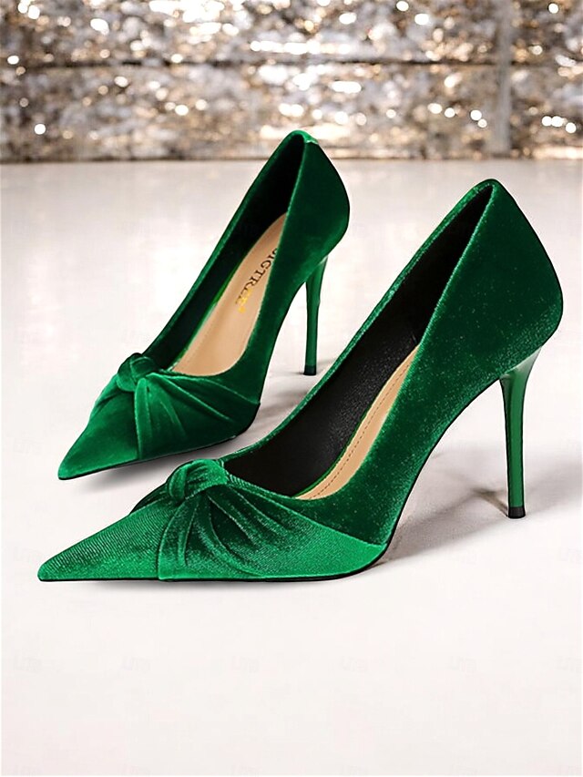 trending ! Women's Green Velvet Stiletto Heels - Elegant Pointed Toe Pumps with Knot Detail for Evening Parties and Special Occasions