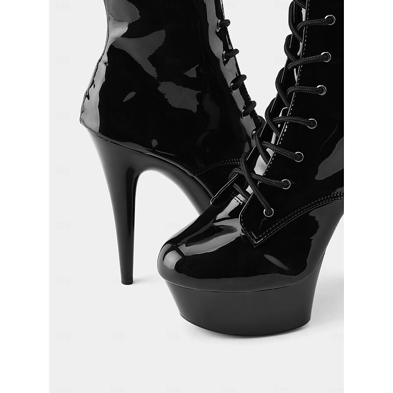 Women's Sexy Heels Black Patent Faux Leather Platform Stiletto Boots with Lace-Up Design and Side Zipper, Ideal for Night Out and Clubwear
