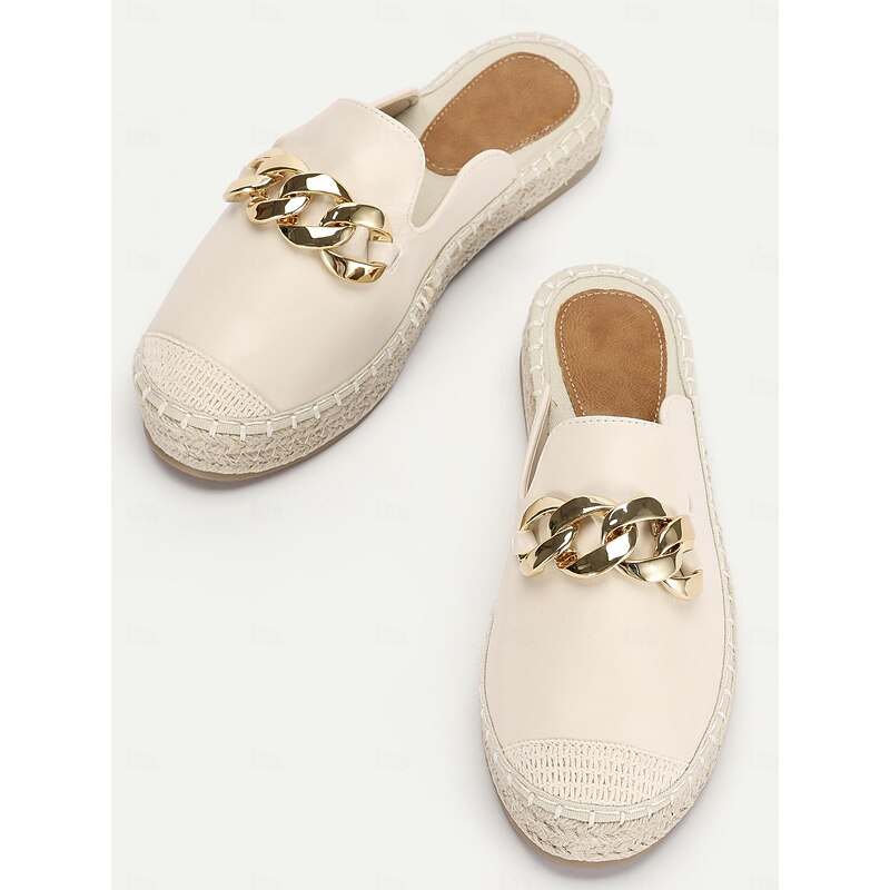 Highlights [Fabric] : Crafted from smooth, cream-colored faux leather, these women's espadrille mules offer a sleek and elegant finish while maintaining durability for everyday wear. The woven detailing on the round toe cap further accentuates the shoe's luxurious texture, making it both fashionable and robust. [Shape] : The casual slip-on design of these espadrille flats ensures ease of wear, while the plush, cushioned tan-colored insole provides comfort for long periods, making them an excellent choice for summer outings and daily use. [Design Highlights] : Featuring a striking oversized gold chain embellishment on the upper, these mules add a touch of contemporary glamour to the traditional espadrille style. The braided jute sole not only offers a slight elevation but also reflects the classic espadrille aesthetic, blending comfort with fashion. [Occasions] : These versatile espadrilles are perfect for a variety of occasions, including vacations and beach outings. Their casual and comfortable style allows them to pair effortlessly with a range of outfits, from jeans to summer dresses, making them ideal for both leisurely and chic settings. [Size Range] : Available in a wide range of sizes from US6 to US11, these mules cater to women seeking a blend of bohemian-inspired casual wear and modern fashion trends. Perfect for everyday use. finest materials and excellent craftsmanship ensure long-lasting durability.