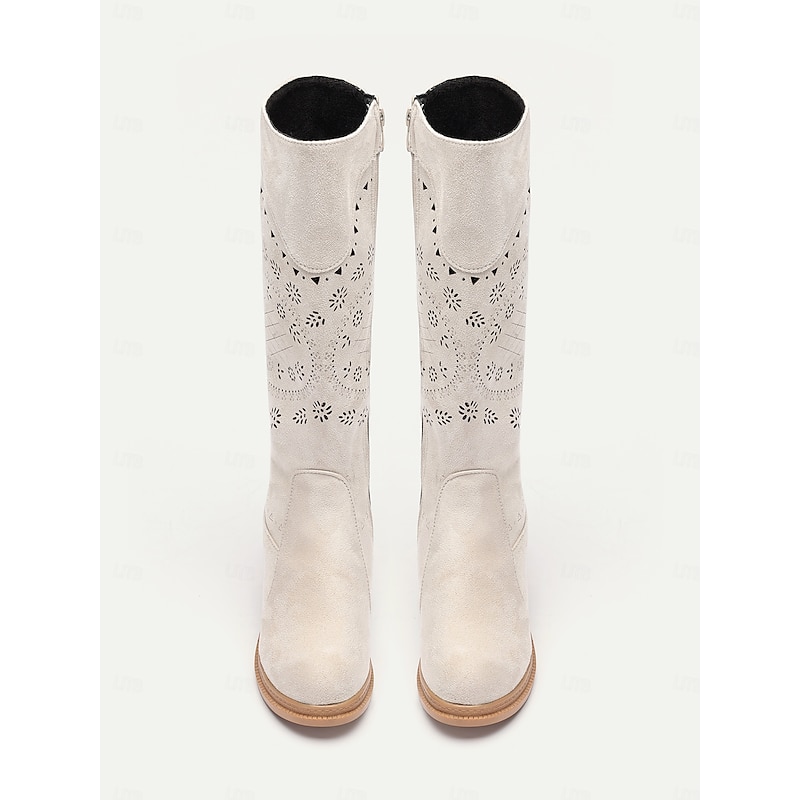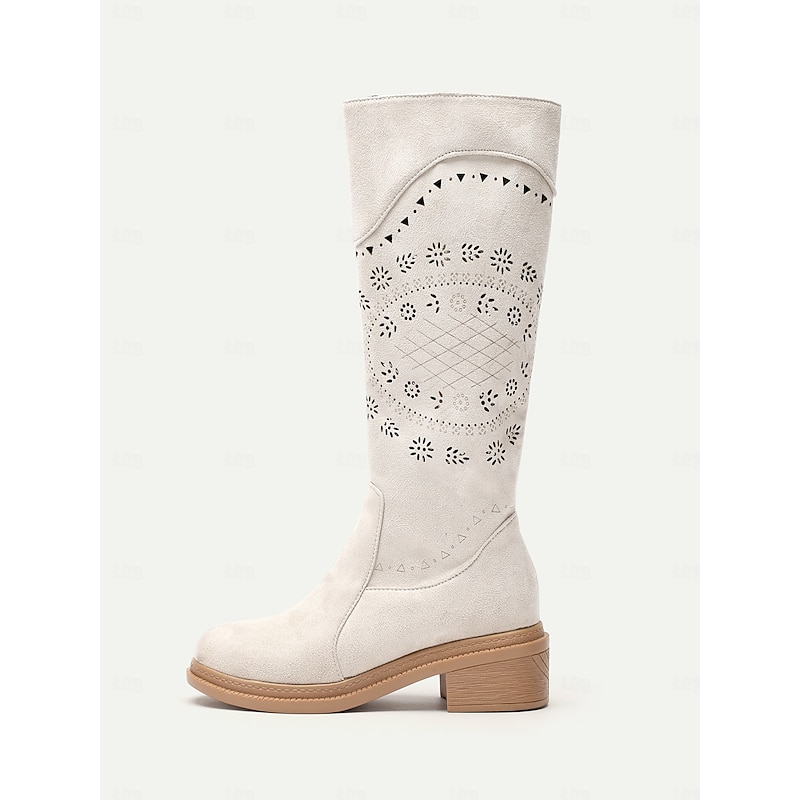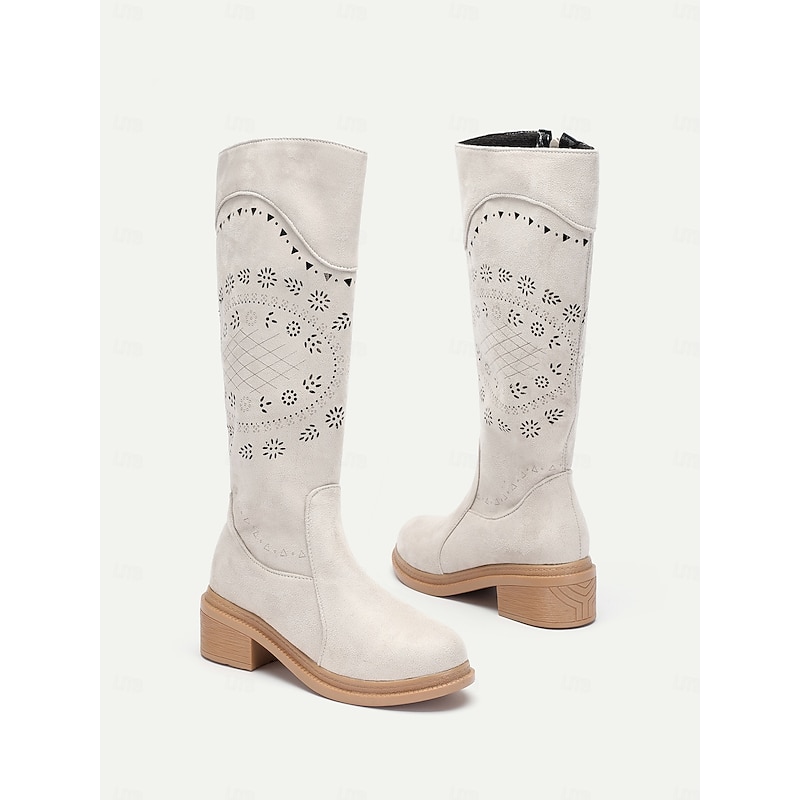 Highlights [Fabric] Crafted from high-quality faux suede, these boots offer a smooth and luxurious texture. The lining is made from synthetic leather and textile materials, ensuring both comfort and durability through the seasons of spring, fall, and winter. [Style] Featuring a mid-calf design, these boots present a vintage aesthetic with a contemporary twist. The chunky heel provides stability, making them suitable for a variety of everyday activities and work environments. [Design Highlights] These boots are embellished with intricate laser-cut detailing and paisley patterns, infusing a touch of bohemian sophistication into the traditional silhouette. The side zipper ensures a secure fit and adds practicality. [Occasions] Perfect for daily wear, work, and casual outings, these boots suit a range of settings, seamlessly complementing both casual and semi-formal attire. Their versatility makes them an essential addition to any wardrobe. [Size Notice] Available in various sizes from US5.5 to US10.5, these boots are designed to fit true to size. Please select your usual size for optimal comfort.