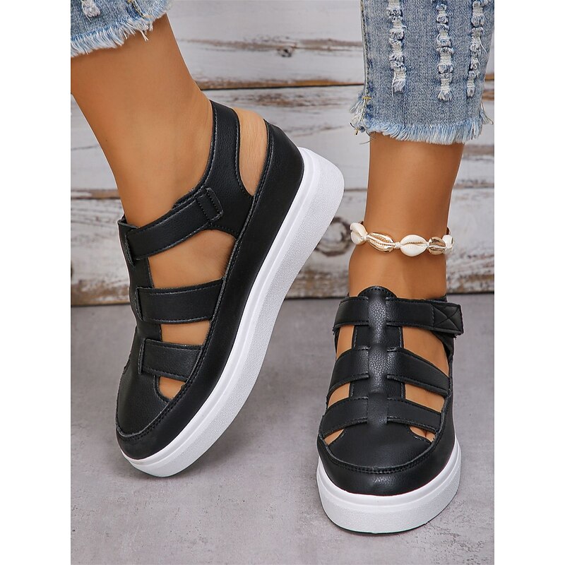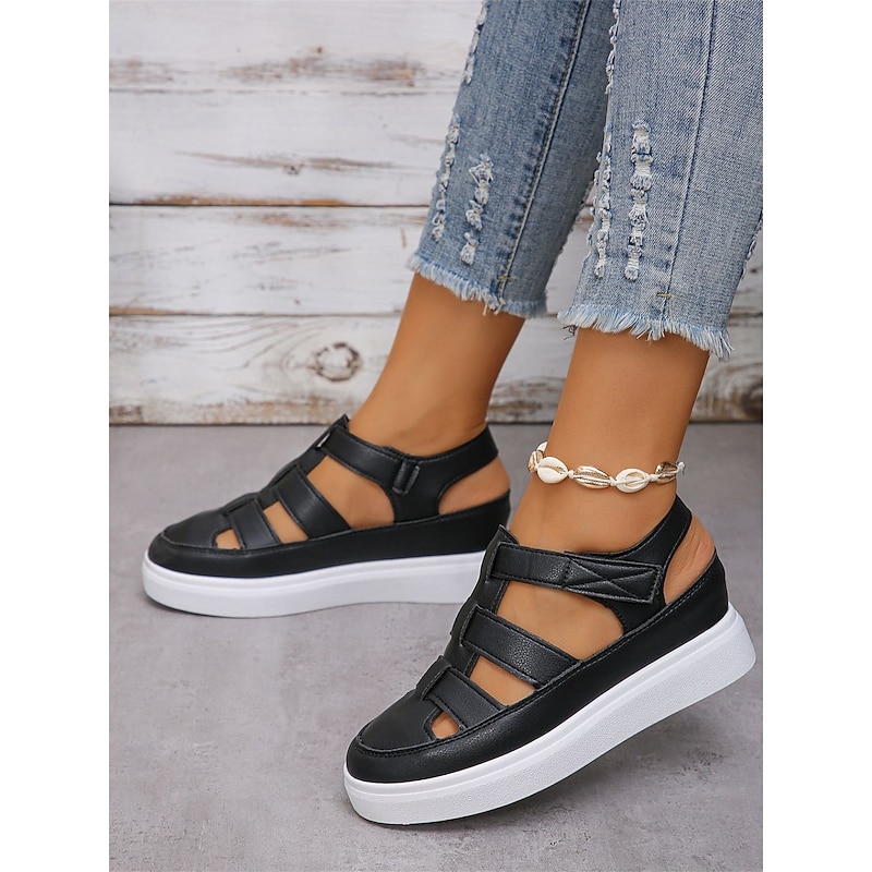 Women's cozy Black Faux Leather Strappy Sandals with White Sole - ideal for Beach or Casual Outings