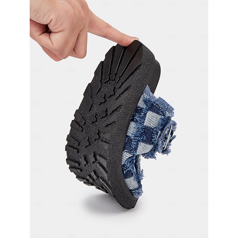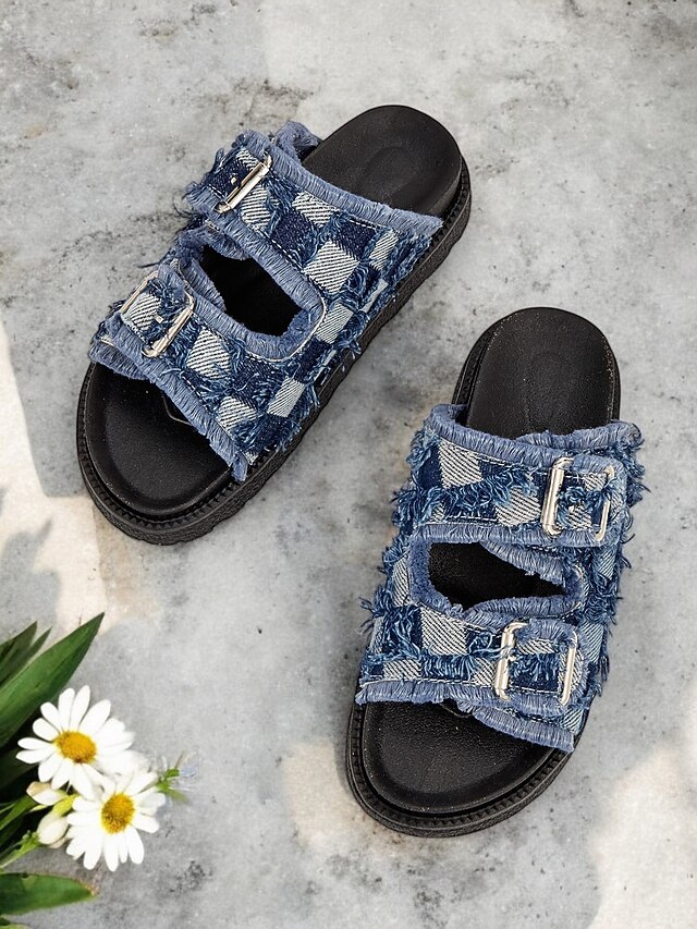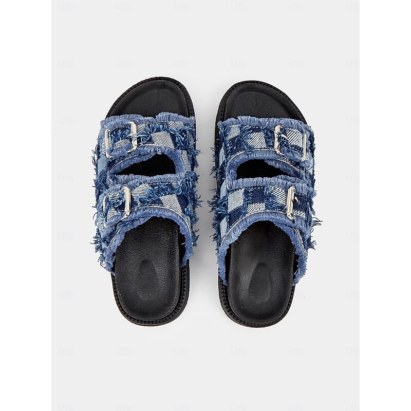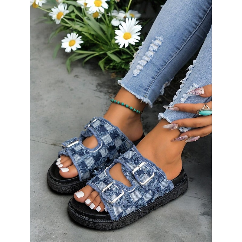 trending ! Women's silky Blue Distressed Denim Double Buckle Slides with Thick Sole Perfect for Everyday Wear