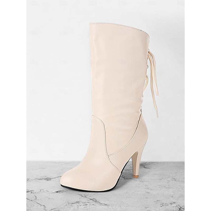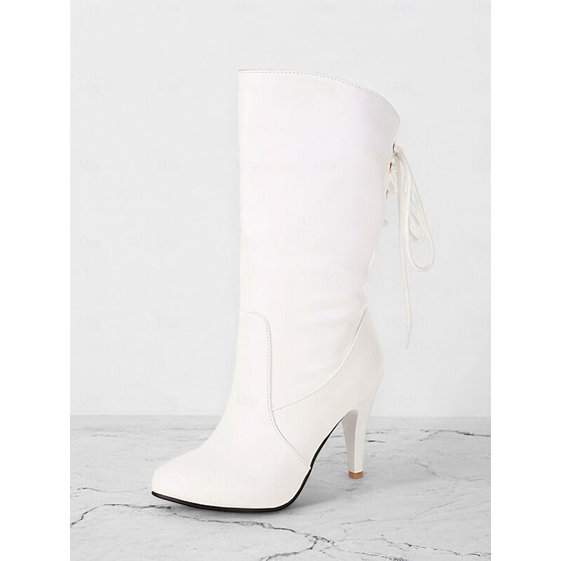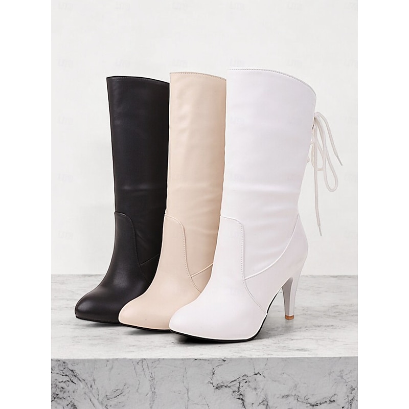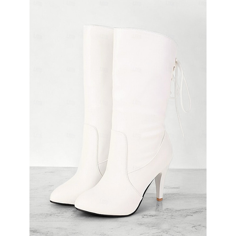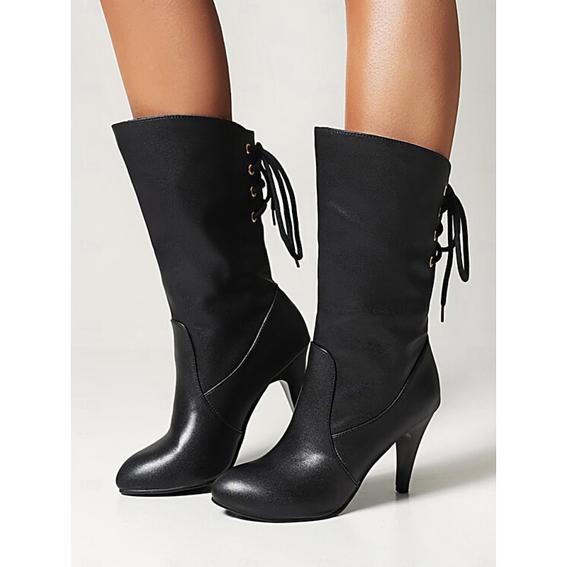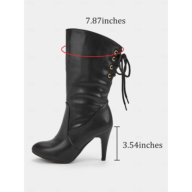 Highlights [Fabric] Expertly crafted from sleek, high-quality faux leather, these boots offer a luxurious and versatile appearance, perfect for elevating any fall and winter outfit. [Fit] Designed as mid-calf boots, they provide a snug fit that beautifully accentuates the legs, making them ideal for pairing with both dresses and pants. [Design Highlights] These boots feature a distinctive pointed toe and stiletto heel, adding an elegant, present-day flair. The side lace-up detail with metallic eyelets not only enhances visual appeal but also offers adjustable comfort. [Occasions] These boots are perfect for both casual and formal occasions, such as work, office settings, or any event where style and sophistication are paramount. They are a must-have addition to the wardrobe of any fashion-forward individual. [Size Notice] Available in a range of sizes from US5.5 to US10.5, catering to various preferences for a comfortable and elegant fit.