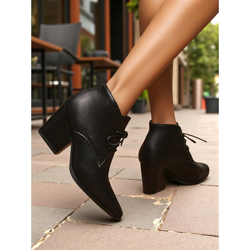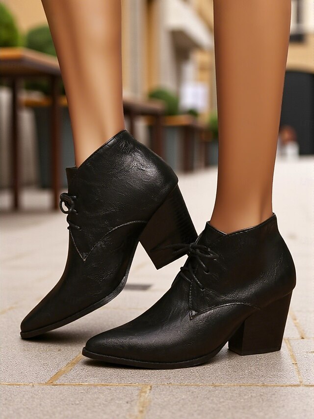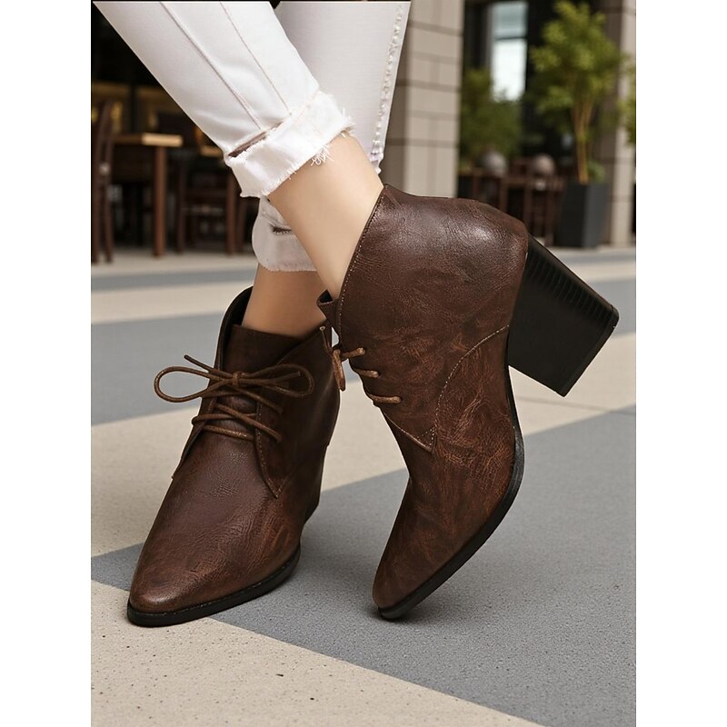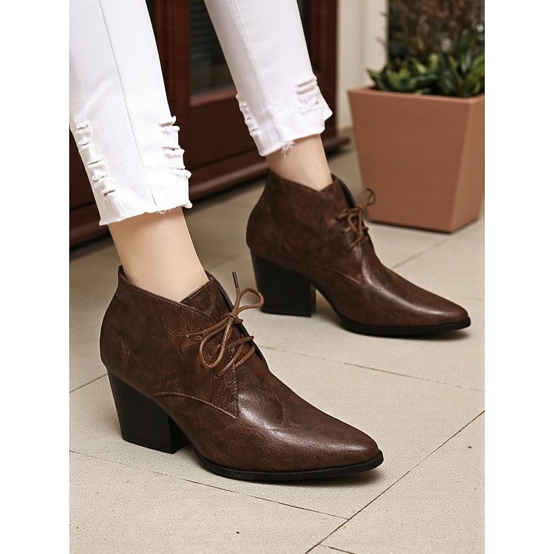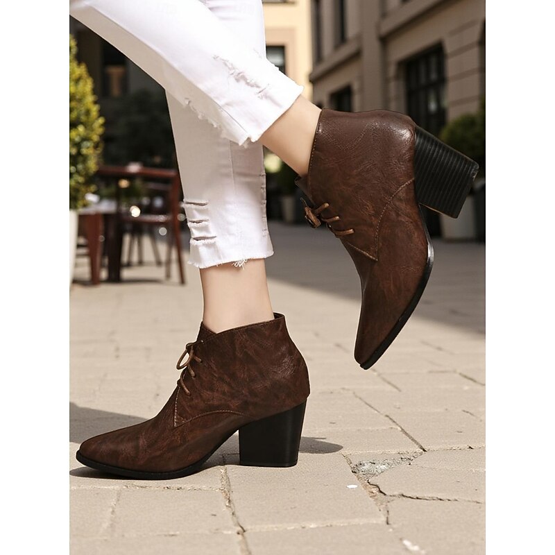 trending ! Women's Retro Lace-Up Pointed Toe Ankle Boots - Faux Leather Block Heel Short Boots for Fall,Street Style & Daily Outfits