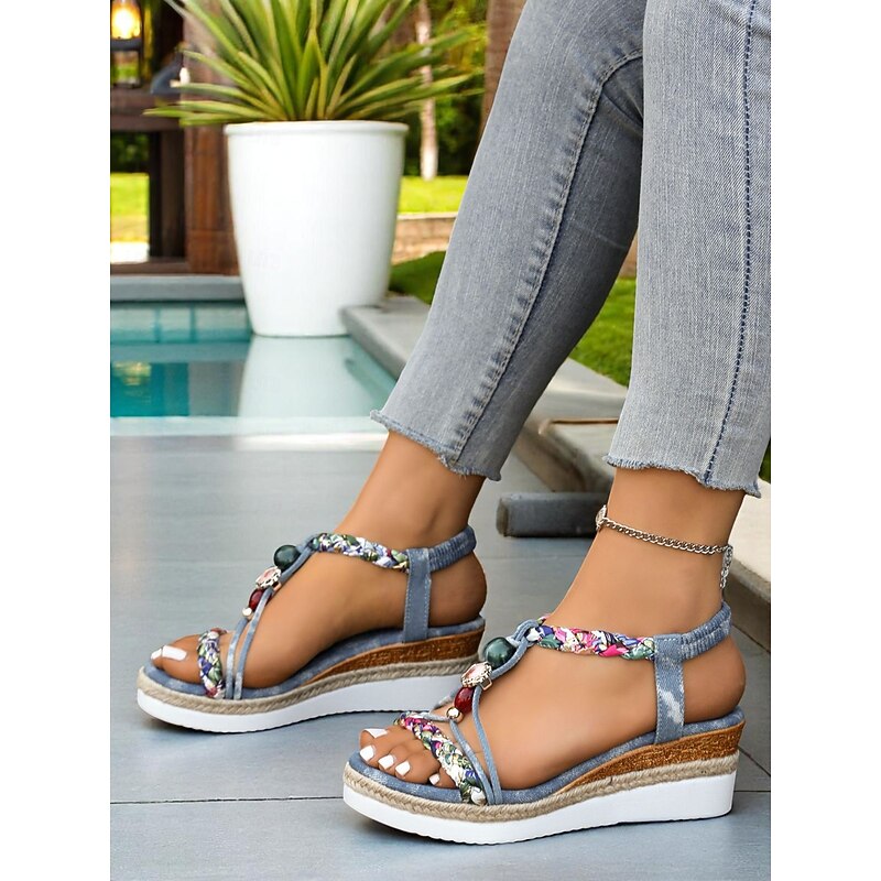 trending ! Women's Multicolor Beaded Boho Wedge Sandals with Braided Straps and Platform Sole – Casual Summer Beach Shoes for Ladies' Vacation and Resort Wear