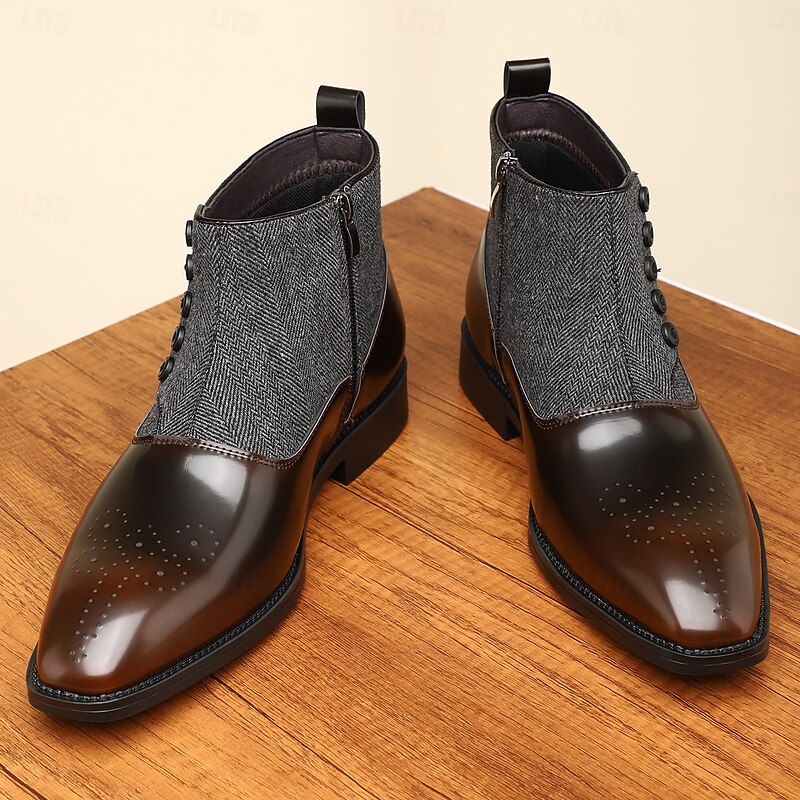 Men's Herringbone Fabric and Faux Leather Button-Up Ankle Boots – Vintage-Inspired Formal Dress Shoes for Business and Casual Occasions