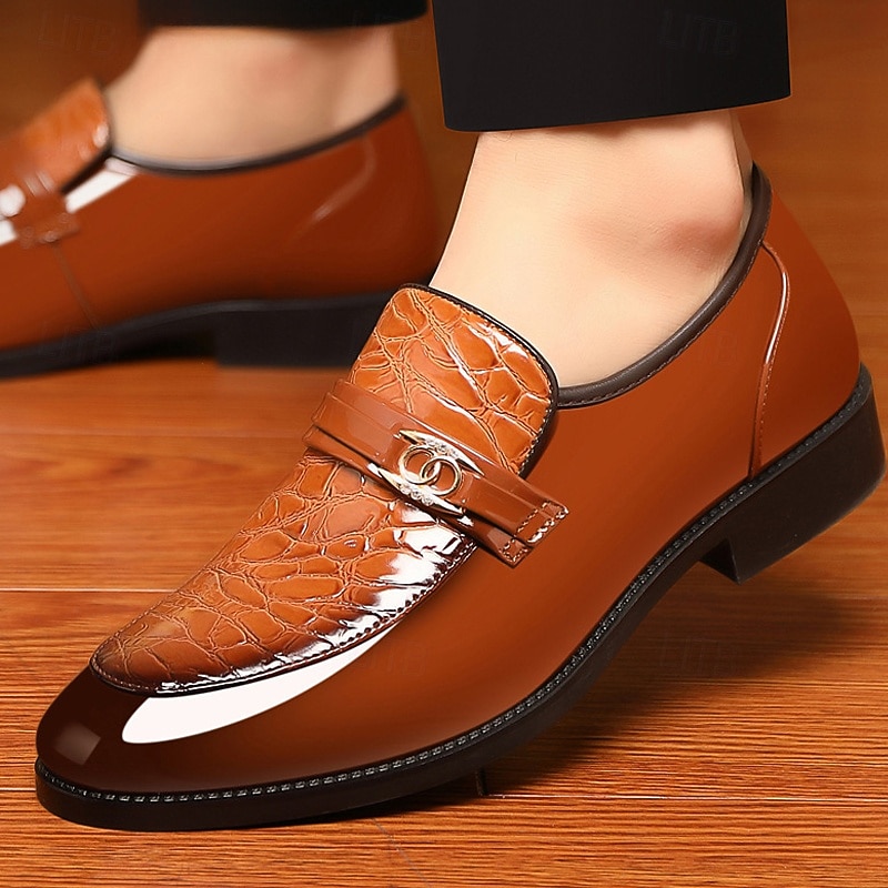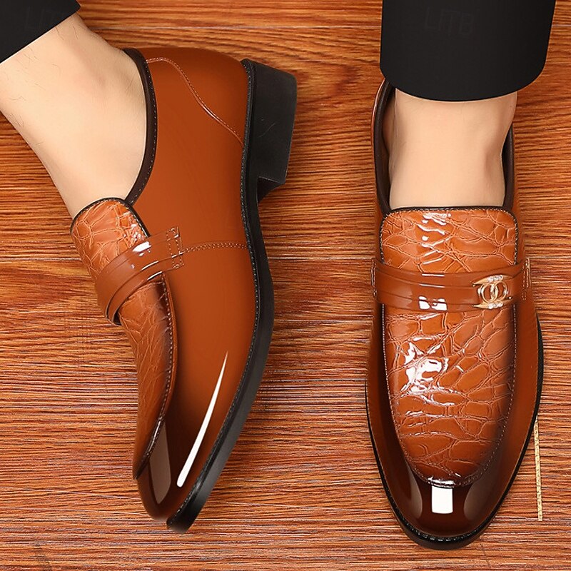 More information about Men's Brown Patent Faux Leather Loafers – Crocodile Pattern Slip-On Dress Shoes with Metal Decoration for Formal and Business Attire