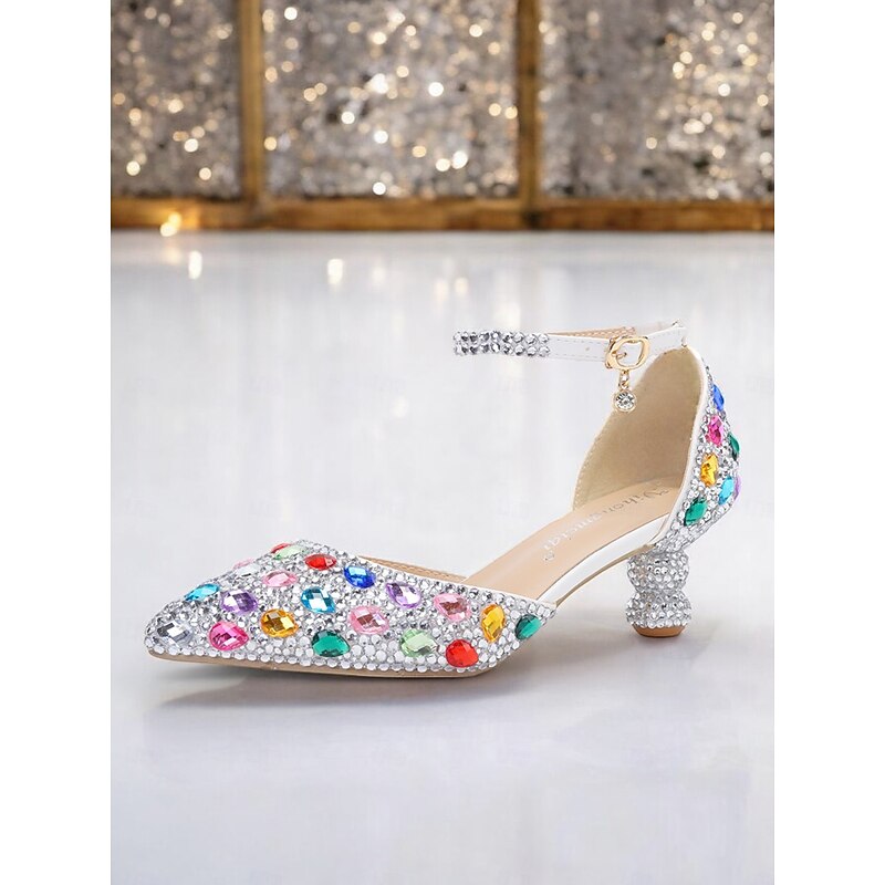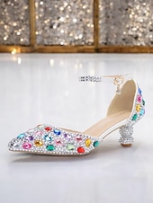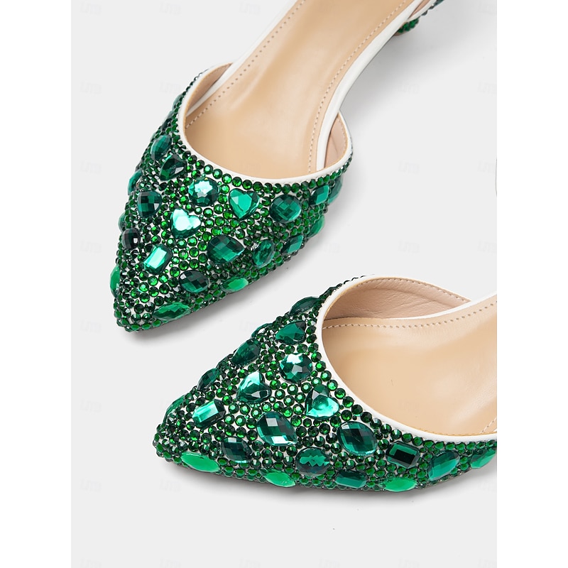 Highlights [Fabric and Fit]: Crafted with a luxurious pointed toe design, these women's heels feature a sparkling glitter upper that exudes elegance and sophistication. The synthetic leather lining ensures a comfortable fit, perfect for extended wear during special occasions. The standard sizing makes it easy to select your usual size for the ideal fit. [Design Highlights]: Each shoe is adorned with exquisite emerald green gemstones and a chic ankle strap embellished with matching stones, fastened with a delicate gold buckle. The exceptional sculptural heel is intricately covered in green gemstones, providing a bold yet refined accent. These design elements come together to create a glamorous, jewel-embellished aesthetic. [Occasions]: Ideal for weddings, parties, and various formal events, these heels bring a touch of artistic design and opulent detailing to any evening ensemble. Whether it's a gala or a special gathering, the shoes add an enchanting shimmer to your look. [Size Range and Suggestions]: Available in a range of sizes from US6 to US10.5, these heels are designed to accommodate a variety of foot sizes comfortably. Customers are encouraged to select their usual shoe size for the best fit. [Note]: The outsole is crafted from durable foam rubber, providing stability and support, ensuring that these shoes remain a staple in your wardrobe across seasons—Spring, Summer, Fall, and Winter. Perfect for everyday use. finest materials and excellent craftsmanship ensure long-lasting durability.