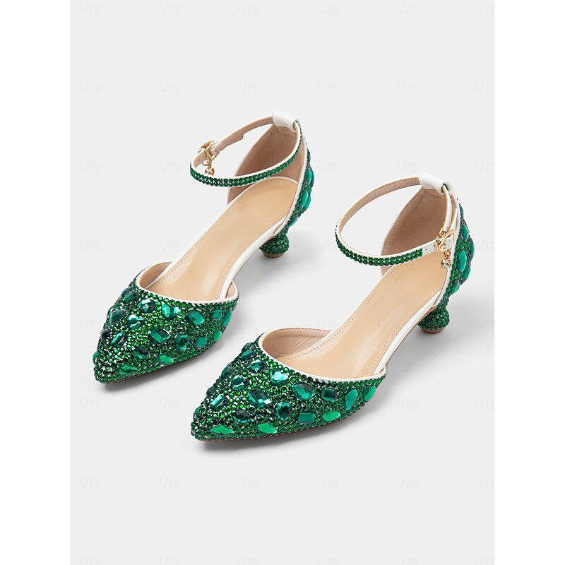 Women's Green Rhinestone Pointed-Toe Heels with Ankle Strap - Glamorous Jewel-Embellished Pumps for Evening and Special Occasions