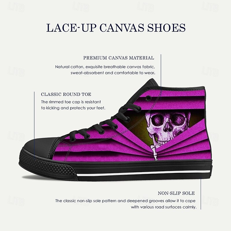 $46.99 - Women's Purple Striped Canvas High Top Sneakers with Skull Graphic – Gothic Halloween Fashion Shoes for Casual Wear and Costume Parties 2025. Shop for cheap Shoes For Women online? Buy at lightinthebox.com on sale today!