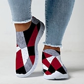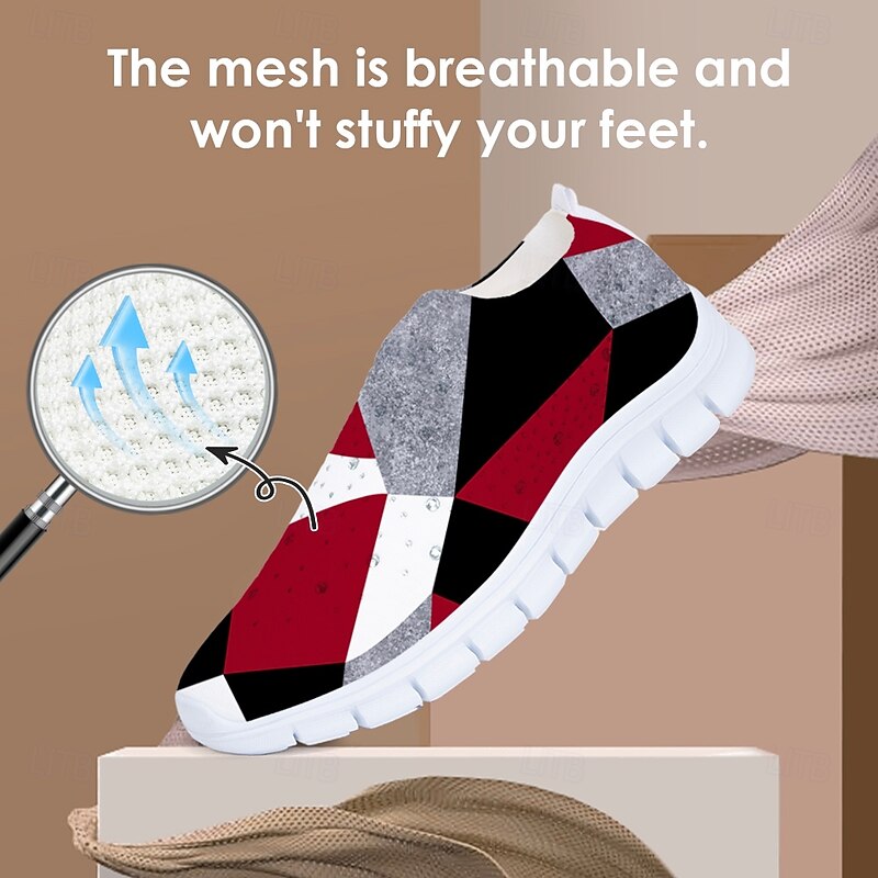 Highlights [Fabric and Design:] Crafted with a breathable Flyknit upper, these Women's Abstract Art Print Slip-On Sneakers showcase a vibrant geometric pattern in shades of red, black, gray, and white. The lightweight fabric ensures comfort throughout the day, while the eyecatching design adds a bold statement to your casual look. [Shape and Comfort:] Featuring a round toe and a flexible rubber sole, these sneakers provide excellent grip and durability. The flat heel design makes them perfect for everyday wear, offering a comfortable fit for all-day walking or running activities. [Design Highlights:] The slip-on style ensures hassle-free wear, complemented by a contemporary loafer closure. The contrast color pattern enhances the sporty and casual vibe, making these sneakers a fashionable choice for those looking to stand out. [Occasions:] Ideal for daily outings, outdoor activities, and casual events, these sneakers allow you to enjoy comfort without compromising on style. Whether you're taking a stroll in the park or running errands, these shoes are a perfect match for any casual or athletic occasion. [Size Range:] Available in a range of sizes from US5.5 to US10.5, these sneakers are designed to fit a variety of foot sizes, ensuring a perfect fit for women looking for comfort and style in their footwear. Perfect for everyday use. excellent materials and excellent craftsmanship ensure long-lasting durability.
