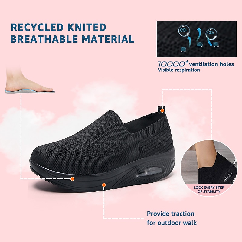 Highlights [Fabric] : Crafted with a breathable and flexible flyknit material, these slip-on sneakers ensure a comfortable and snug fit. The fabric's subtle perforations enhance airflow, making these shoes perfect for daily casual use and extended wear. [Fit] : Featuring a classic slip-on design, these sneakers come with a platform sole that provides a slight elevation for a modern, sporty look. The flat heel ensures comfort throughout the day, making them an excellent choice for all-day wear. [Design Highlights] : The sneakers boast a solid color exterior in a range of hues, including black, pink, and red, with a exceptional outsole pattern for added grip and stability. The round toe design complements the sporty, casual style, ideal for making a fashion statement while ensuring comfort. [Occasions] : Perfect for outdoor activities, daily errands, and casual outings. These sneakers are designed to offer a fashionable yet comfortable option for walking and other active pursuits, fitting seamlessly into your spring and fall wardrobe. [Size] : Available in sizes ranging from US6 to US10, these sneakers cater to a variety of foot sizes, offering a versatile fit for many customers. Perfect for everyday use. finest materials and excellent craftsmanship ensure long-lasting durability.