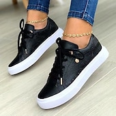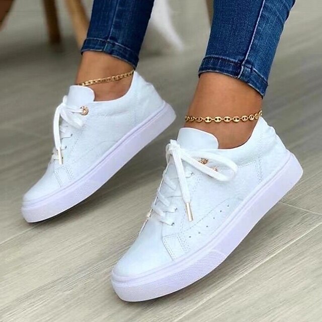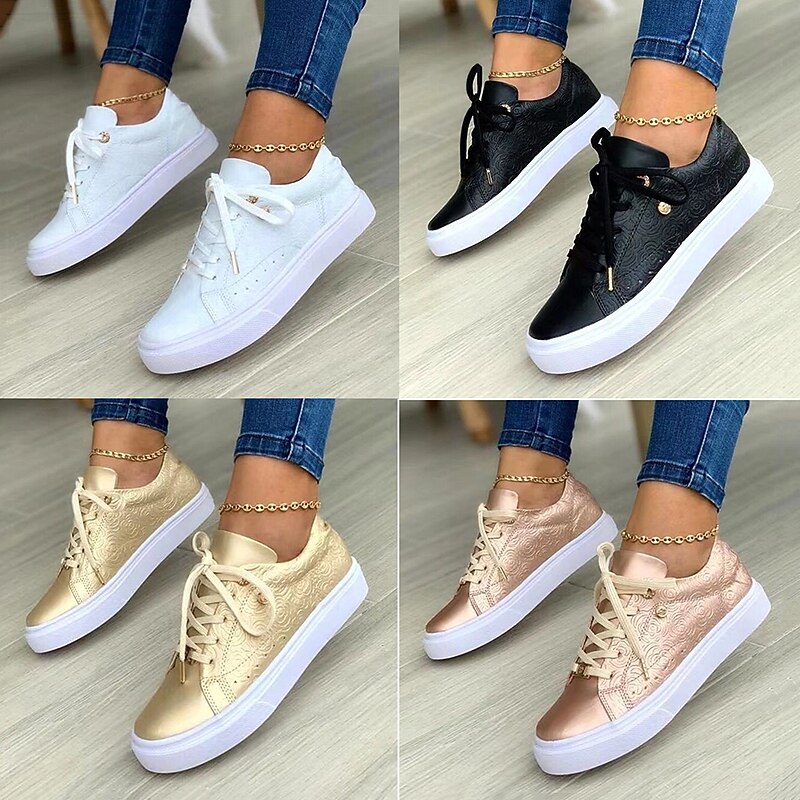 Highlights [Fabric] : Crafted from premium PU leather, these women's sneakers offer durability and easy maintenance. The high-quality synthetic material is designed for comfort and long-lasting use, making them ideal for everyday wear across multiple seasons, including spring, summer, and fall. [Silhouette] : Featuring a classic low-top silhouette, these sneakers boast a flat heel and round toe design. The sleek, minimalistic look ensures they complement a variety of casual styles and outfits, adding a touch of elegance to any ensemble. [Design Highlights] : These sneakers feature a chic lace-up front, providing a secure and adjustable fit. The subtle stitching detail enhances the shoes' aesthetic, while the rubber sole offers excellent grip and cushioning for all-day wear, ensuring both style and comfort. [Occasions] : Perfect for daily wear and outdoor activities, these sneakers are an excellent choice for walking and casual outings. The versatile design makes them suitable for a range of occasions, bringing a fresh, sporty vibe to your everyday look. [Size Range] : Available in sizes ranging from 36 to 43, these sneakers cater to a broad size spectrum, ensuring a comfortable fit for everyone. The clean white color option adds a present-day freshness to your wardrobe, while additional colors like gold, black, and pink offer more personalization choices. Perfect for everyday use. excellent materials and excellent craftsmanship ensure long-lasting durability.