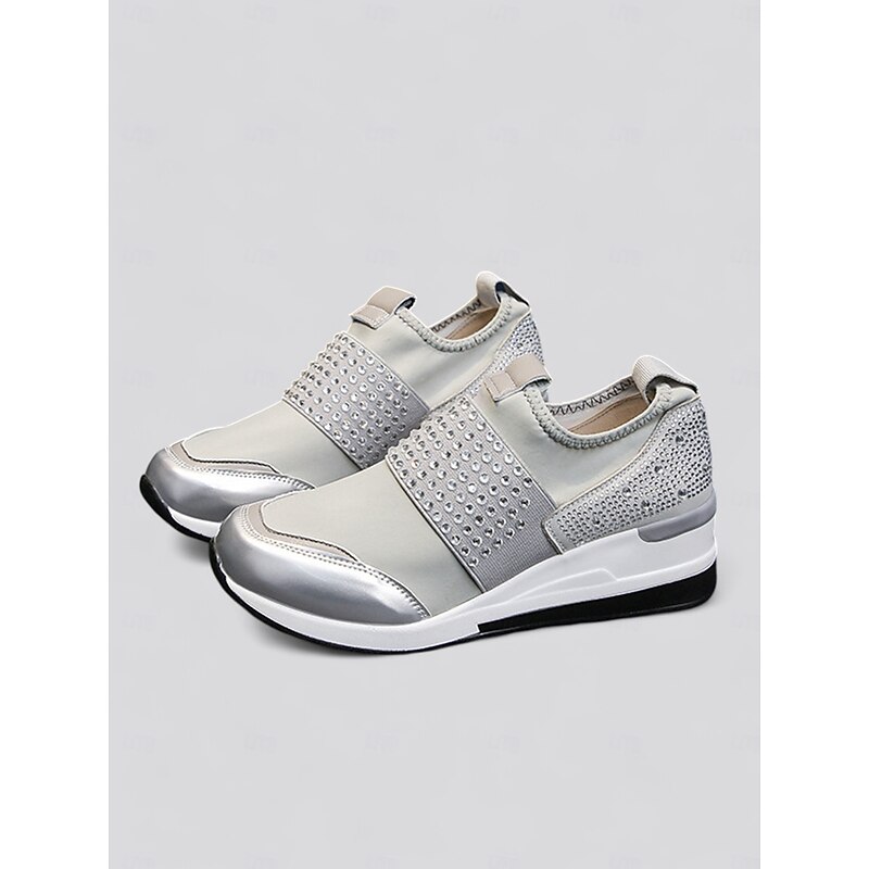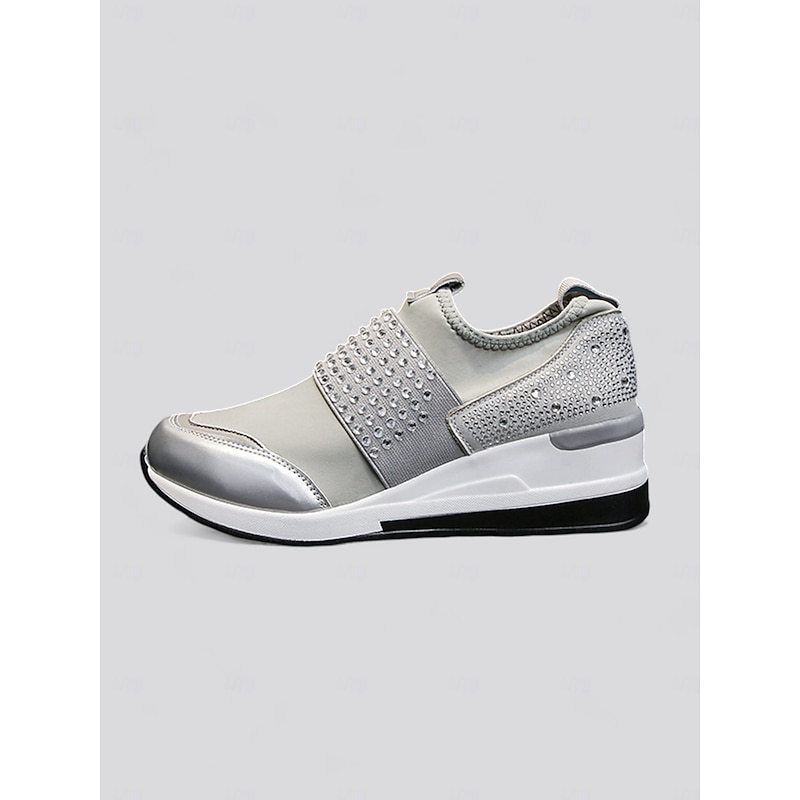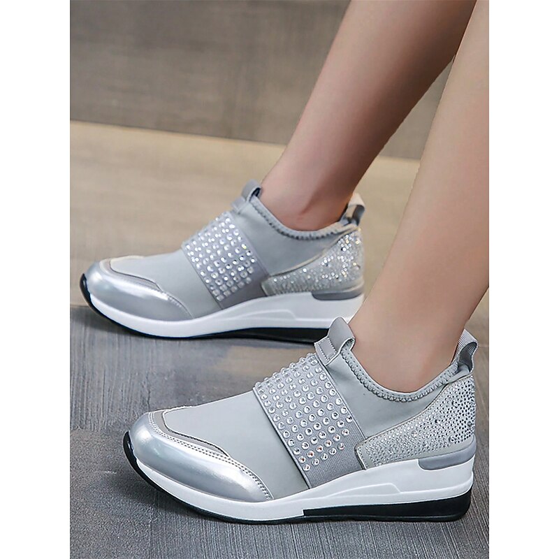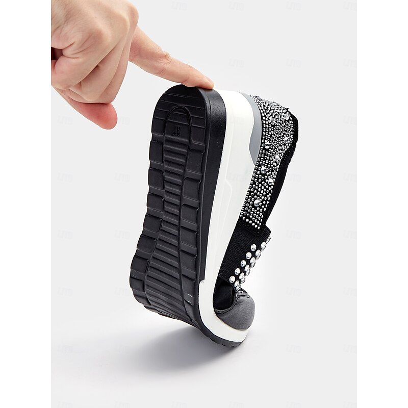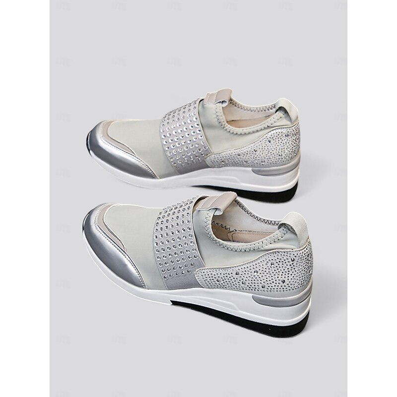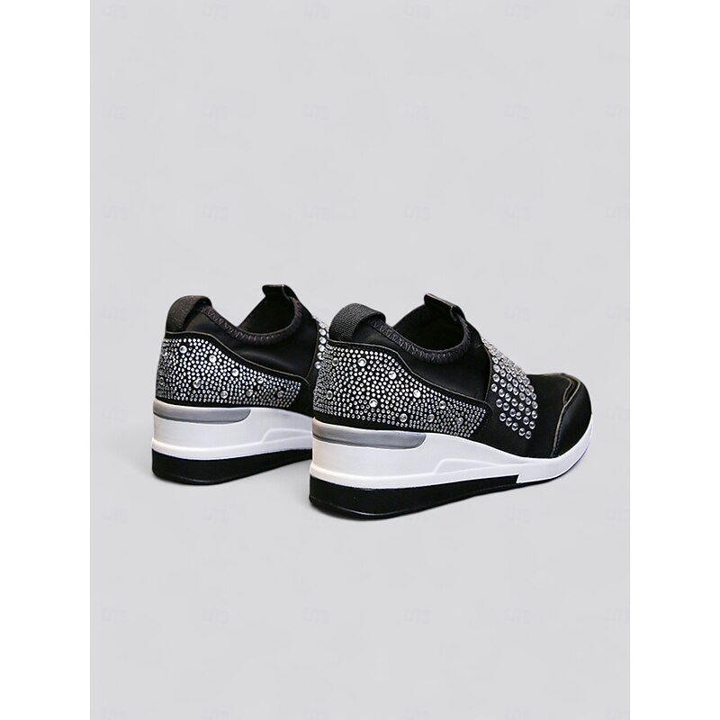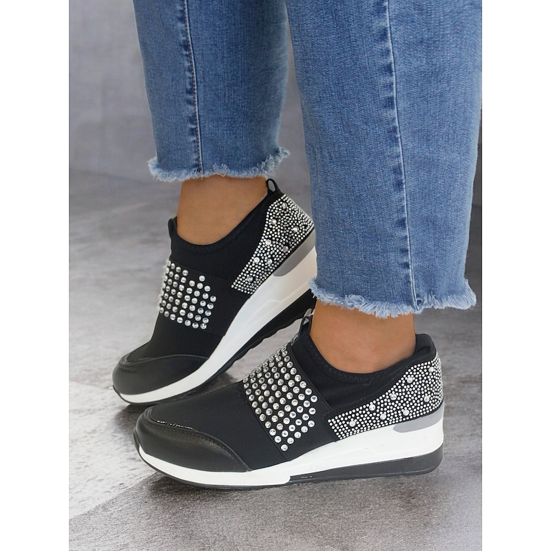 Highlights [Fabric] : Crafted with a blend of faux leather, elastic fabric, and cloth, these platform sneakers offer a flexible and comfortable fit that adjusts to your every step, ensuring all-day comfort. [Fit] : Designed in a slip-on style for effortless wear, these sneakers boast a present-day silhouette with a chic round toe, perfectly blending casual comfort with minimalist elegance. [Design Highlights] : The standout feature of these sneakers is the eye-catching rhinestone embellishments that grace the upper, adding a glamorous touch of sparkle. The reinforced toe cap and padded heel enhance durability and support, while the sturdy wedge heel elevates your style with a fashionable boost. [Occasions] : Ideal for daily wear, these chic sneakers transition seamlessly from leisurely outings to more active pursuits, offering versatility for various activities and wardrobes. [Size Range] : Available in an extensive range of sizes from US6 to US10.5, ensuring a comfortable fit for everyone looking to add a touch of glamour to their everyday footwear.