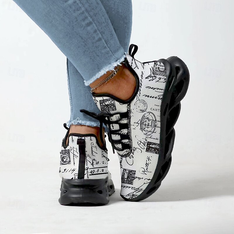 Women's Vintage Letter Print Sneakers - Black and White, Lightweight and Breathable Design, Ideal for Casual Outfits and Streetwear Fashion