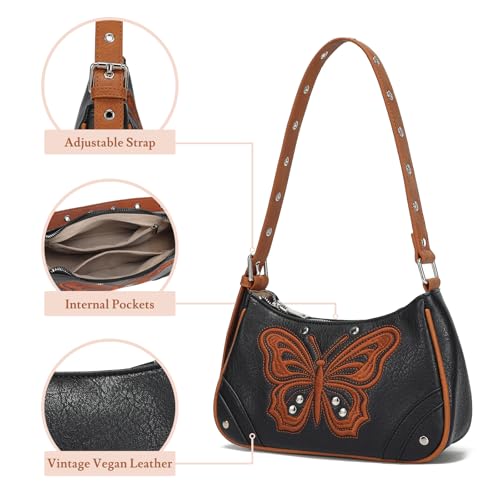 • modern Y2K Butterfly Design: This shoulder bag for women features a distinctive butterfly embroidery with rivet details, adding a touch of retro charm. The perfect small purse for those who love 90s fashion.