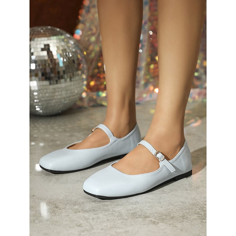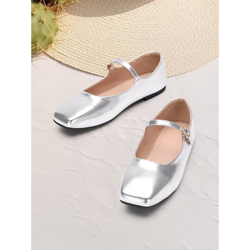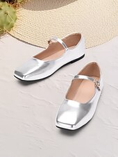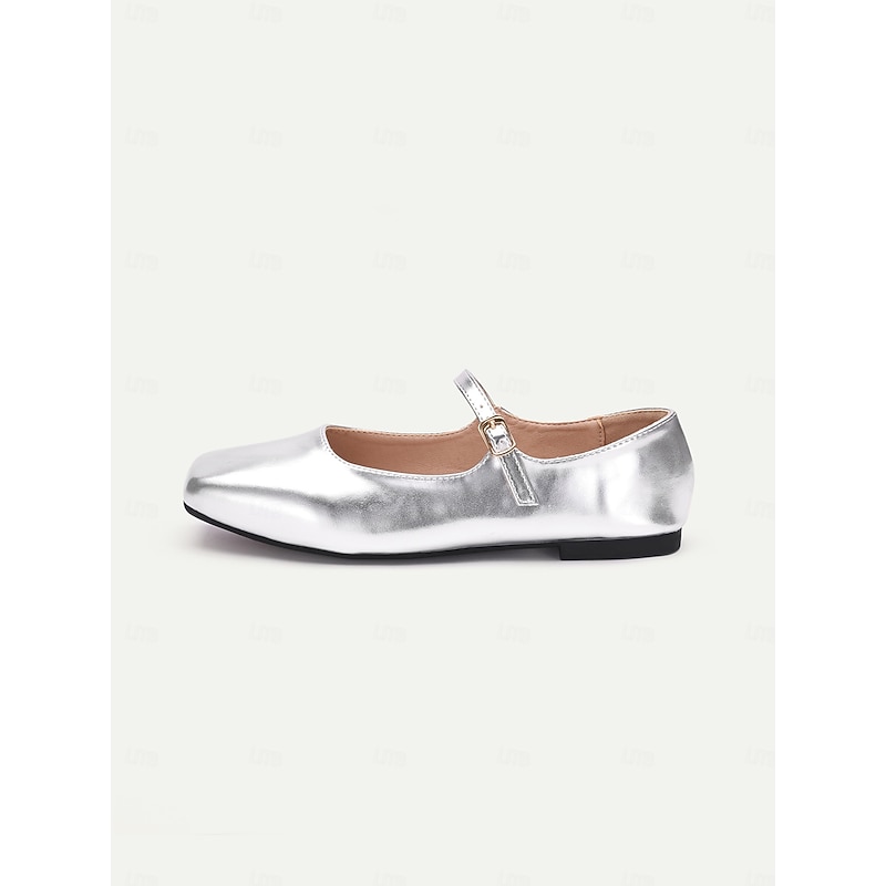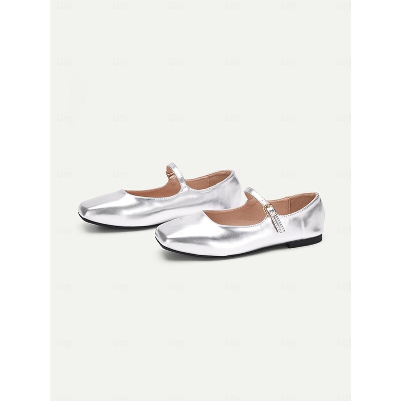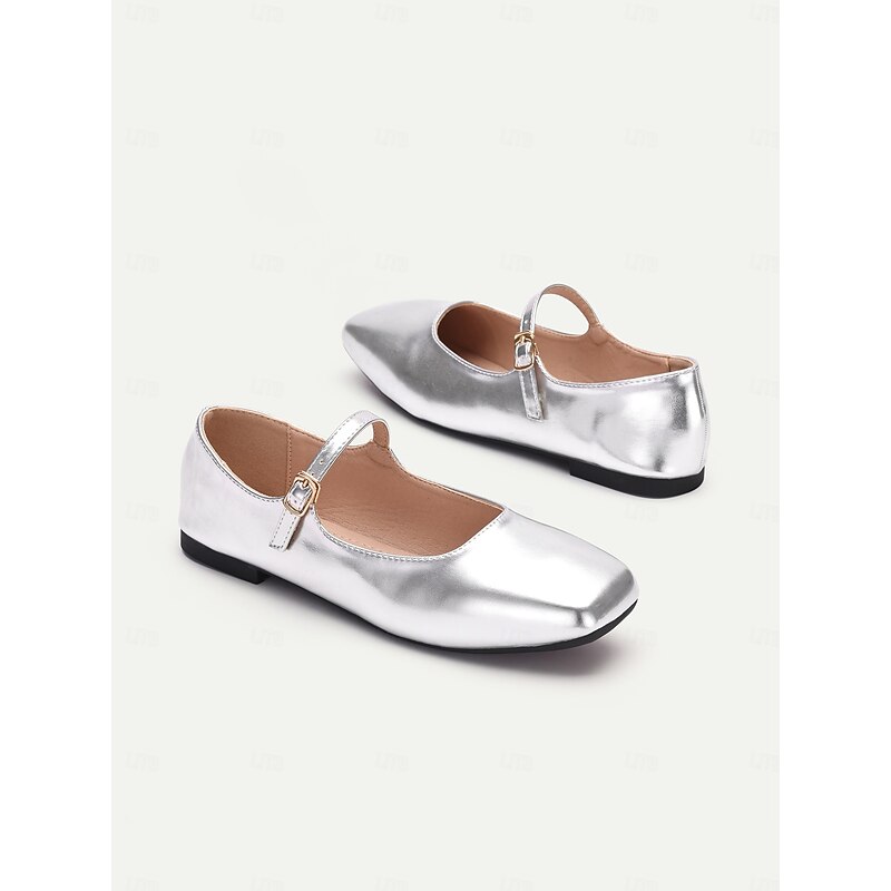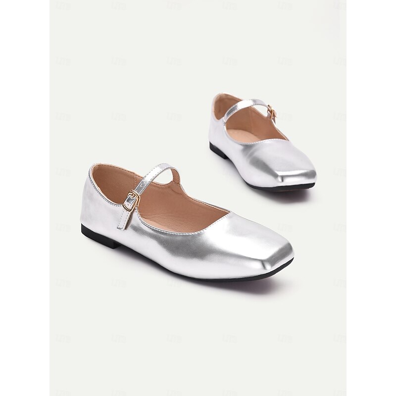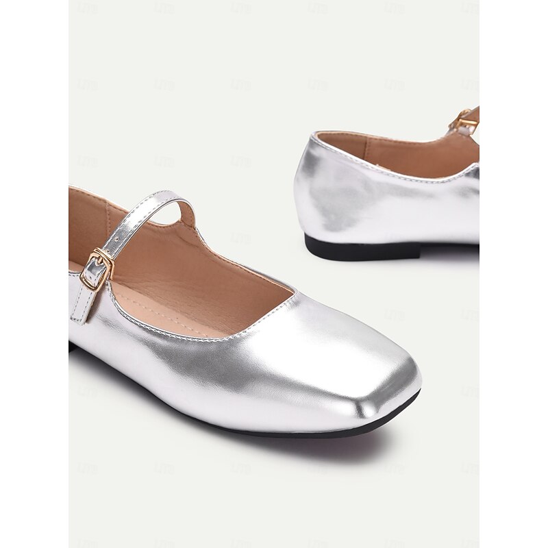 Highlights [Fabric] : Crafted from high-quality faux leather, these women’s flats are designed to provide both style and durability. The metallic finish offers a contemporary and chic appearance, making these shoes a versatile choice for any wardrobe. [Fit] : Featuring a iconic Mary Jane style with a flat heel, these shoes offer all-day comfort and easy wearability. The ankle strap with an adjustable buckle ensures a secure and personalized fit, perfect for everyday wear. [Design Highlights] : These Mary Jane flats showcase a sleek square toe and a single thin strap with a delicate gold buckle, adding a touch of elegance to the overall look. The metallic finish in various colors such as silver and gold enhances their sophisticated appeal, making them suitable for both casual and formal occasions. [Occasions] : Ideal for a range of activities including vacations, daily outings, work, and outdoor events. Whether you are heading to the office or enjoying a day out, these flats add a touch of elegance and charm to any outfit. [Size Range] : Available in a wide range of sizes, from US5.5 to US11, ensuring a comfortable fit for a variety of foot sizes.