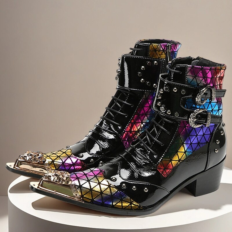 This Men's Black Genuine Leather Multicolor Geometric Pattern Cowboy Boots with Studs and Buckles, 100% Cowhide Western Ankle Boots for Concerts and Rock Stage Fashion combines elegant design with practical functionality. Every detail has been carefully considered to ensure you get the top possible experience. The supreme construction means this product will serve you well for years to come.