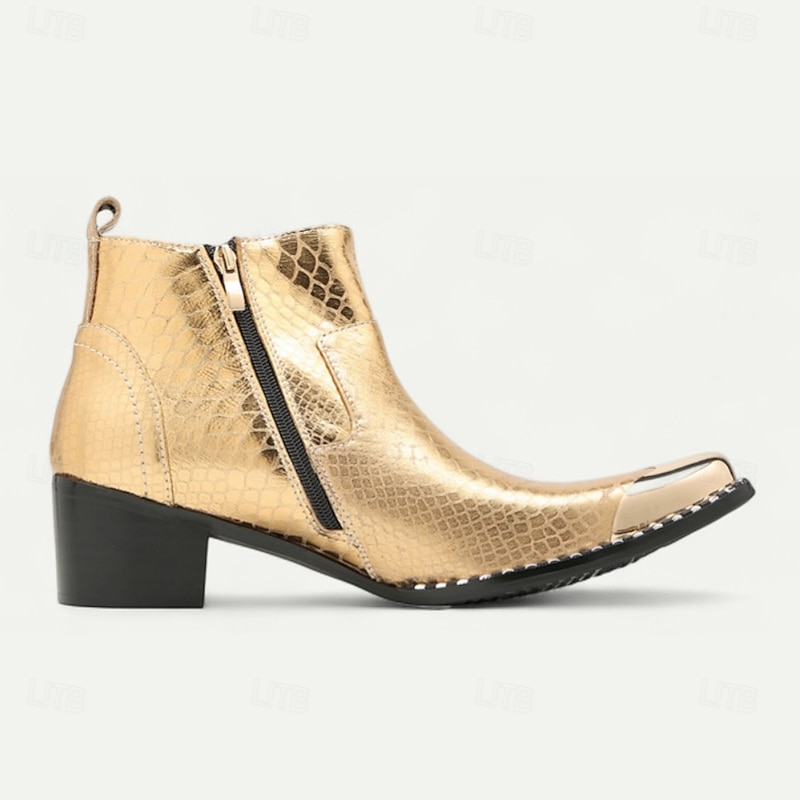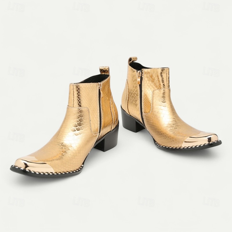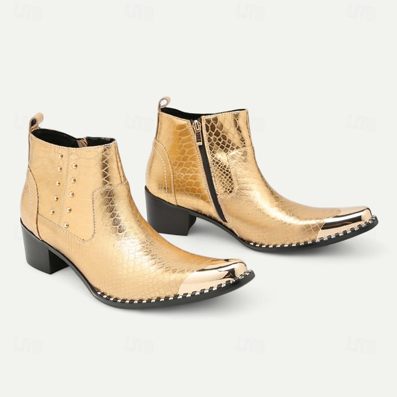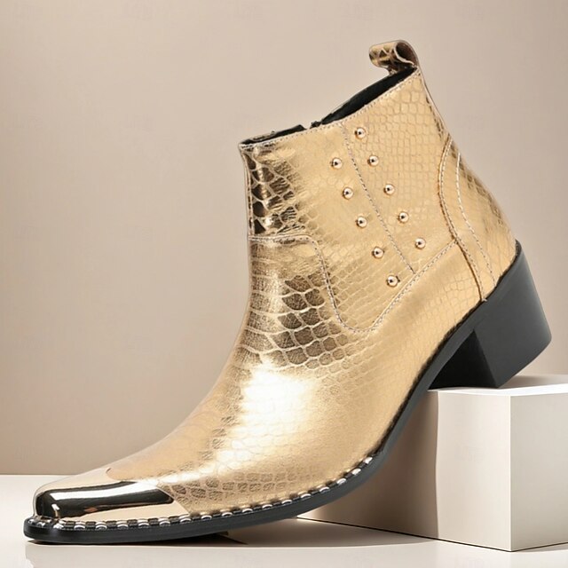 trending ! Men's Gold Crocodile Print Ankle Boots – Luxury Metallic Cowhide Zip-Up Boots with Stud Accents for Performances, Galas and Nightlife Wear