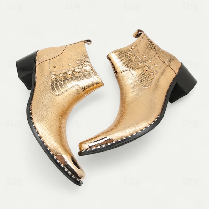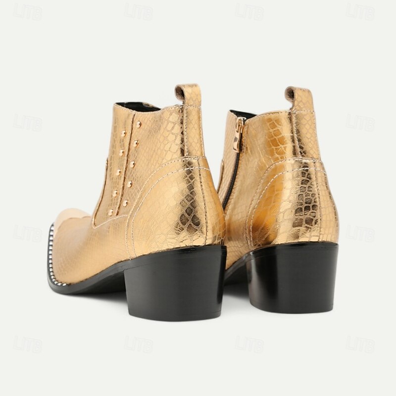 More information about Men's Gold Crocodile Print Ankle Boots – Luxury Metallic Cowhide Zip-Up Boots with Stud Accents for Performances, Galas and Nightlife Wear