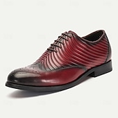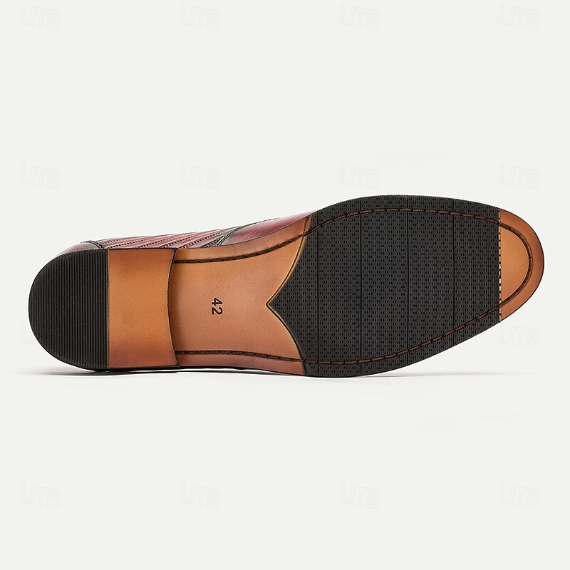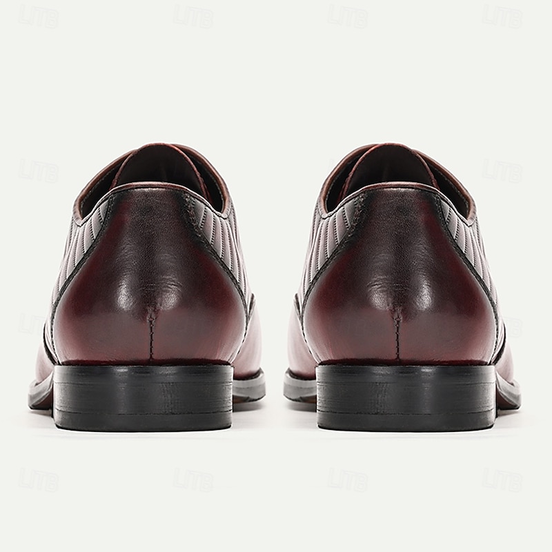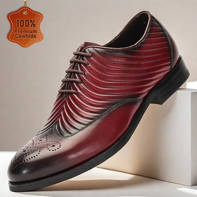 Highlights [Material and Craftsmanship] : Made from 100% high-quality cowhide leather, these men's dress shoes ensure durability and a luxurious feel. The leather's natural sheen and smooth texture highlight the sophisticated craftsmanship, making them a staple in any formal wardrobe. [Silhouette and Style] : These oxfords feature a classic round toe design complemented by intricate brogue detailing on the toe cap. The sleek silhouette, coupled with a striking gradient of burgundy and black, offers a modern and sophisticated look that seamlessly blends tradition with contemporary fashion. [Design Highlights] : The shoes feature a one-of-a-kind pleated texture on the upper, adding a touch of elegance and creating visual interest. The lace-up closure ensures a secure fit, while the sturdy rubber outsole provides slip resistance and enhanced stability, perfect for a confident stride through any event. [Occasions] : Ideal for weddings, business meetings, and other formal occasions, these shoes add a refined touch to any ensemble. Their versatile design makes them suitable for both professional and personal gatherings, offering style and comfort throughout the fall and winter seasons. [Size Range] : Available in a variety of sizes from US6 / EU39 / UK5 to US13 / EU46 / UK12, these shoes cater to a wide range of feet, ensuring a perfect fit for every gentleman. Perfect for everyday use. excellent materials and excellent craftsmanship ensure long-lasting durability.
