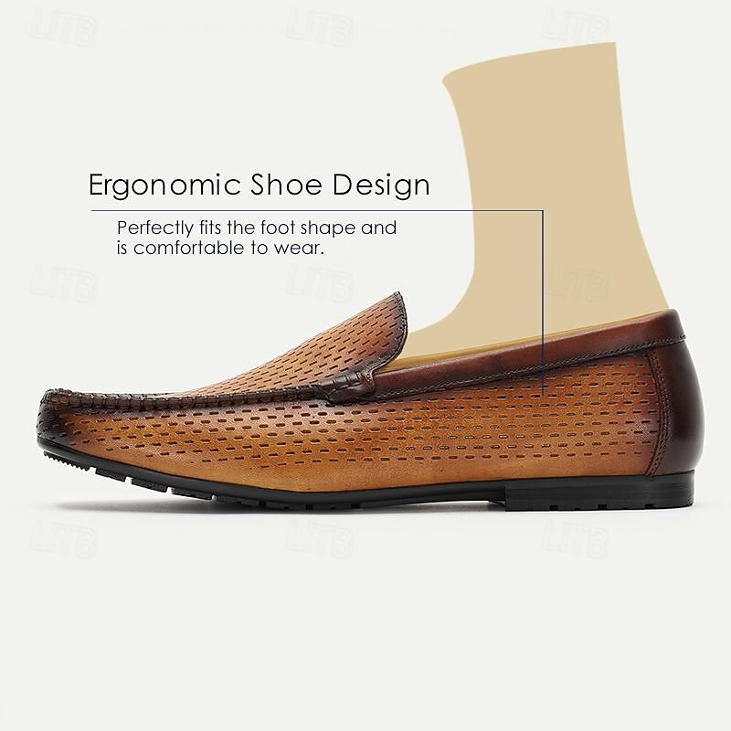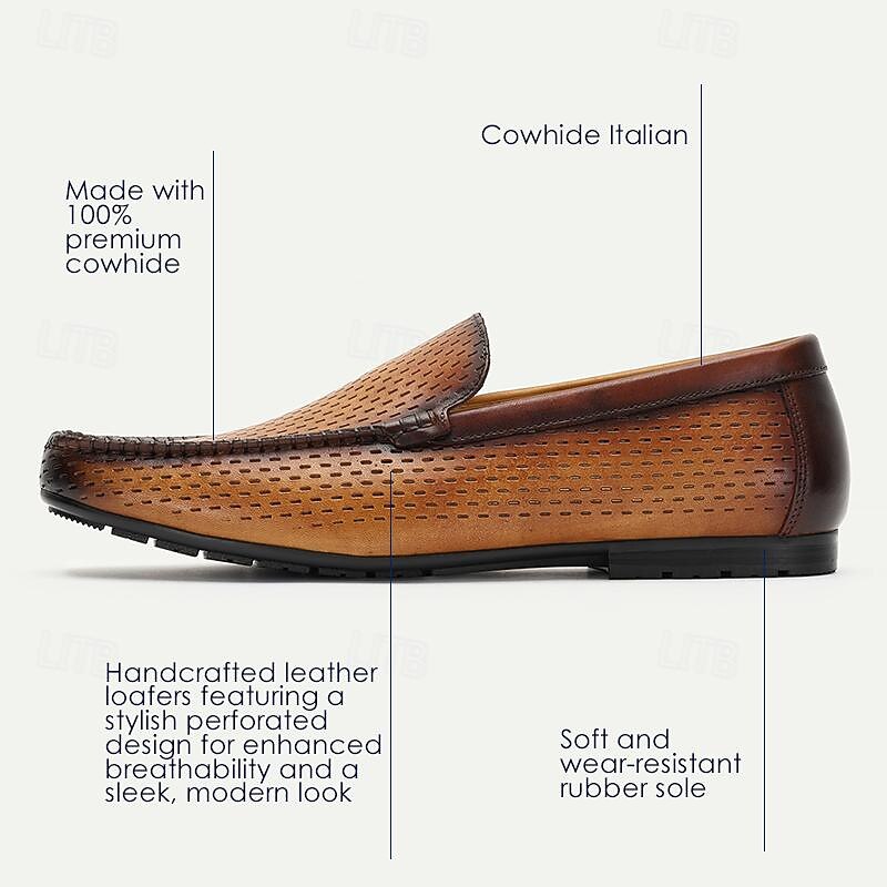 Highlights [Fabric] Crafted from premium 100% Italian full-grain cowhide, these men’s loafers offer a rich texture and natural durability. The leather is meticulously selected for its superior quality, providing a breathable and comfortable experience throughout the day. [Fit] Designed in a timeless moccasin style, these slip-on shoes ensure a comfortable and secure fit. The classic round toe shape adds to the overall ease of wear, making them ideal for long periods of use. [Design Highlights] Featuring a sleek perforated pattern, these loafers combine elegance with functionality. The subtle design offers enhanced breathability, while the durable rubber outsole provides excellent grip and slip resistance. The rich brown color complements the latest gentleman’s wardrobe, suitable for both relaxed and semi-formal settings. [Occasions] Perfect for casual outings, office wear, or weekend gatherings, these loafers are versatile enough for multiple occasions. Whether you're navigating a busy workday or enjoying leisure time, they bring a touch of sophistication and comfort to your style. [Size Range] Available in a comprehensive size range from US6 to US13, these loafers cater to a wide variety of foot sizes, ensuring a perfect fit for every customer. Perfect for everyday use. finest materials and excellent craftsmanship ensure long-lasting durability.