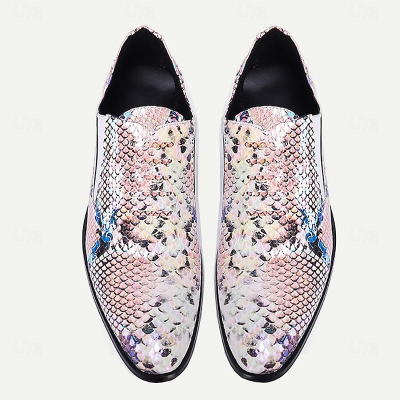 Highlights [Fabric] : Expertly crafted from Italian full-grain cowhide leather, these men's loafers offer a luxurious feel and long-lasting quality. The premium leather material not only enhances the shoe's appearance but also ensures comfort and breathability. [Fit] : Featuring a round toe design, these loafers provide a comfortable fit that caters to both style and ease. The elastic gussets offer a flexible fit, making them easy to slip on and wear throughout the day. [Design Highlights] : These loafers stand out with a vibrant snakeskin pattern that displays a captivating spectrum of pastel colors, subtly interwoven with hints of blue and pink. The robust black rubber sole adds durability, while the low heel provides an elegant lift, perfect for showcasing your exceptional sense of style. [Occasions] : Ideal for formal events, social gatherings, or casual outings where you wish to make a statement. These shoes add a touch of flair and sophistication, making them perfect for those who want to stand out in any setting. [Size Range] : Available in a variety of sizes, these loafers cater to a wide range of foot sizes, from US5 to US13, ensuring a perfect fit for those seeking a bold and upscale addition to their wardrobe. Perfect for everyday use. finest materials and excellent craftsmanship ensure long-lasting durability.