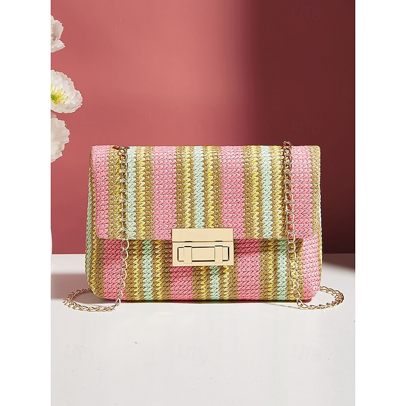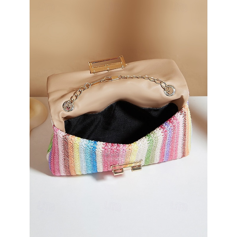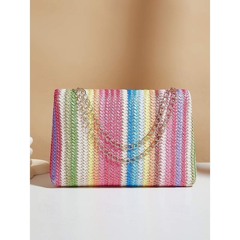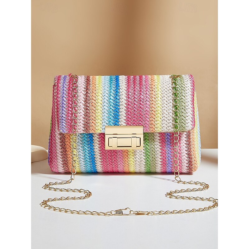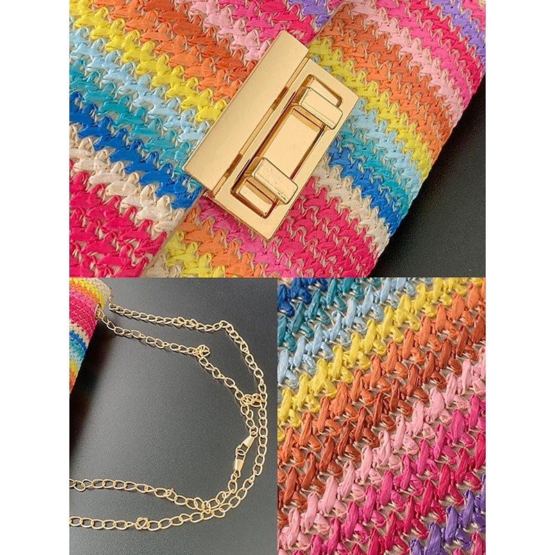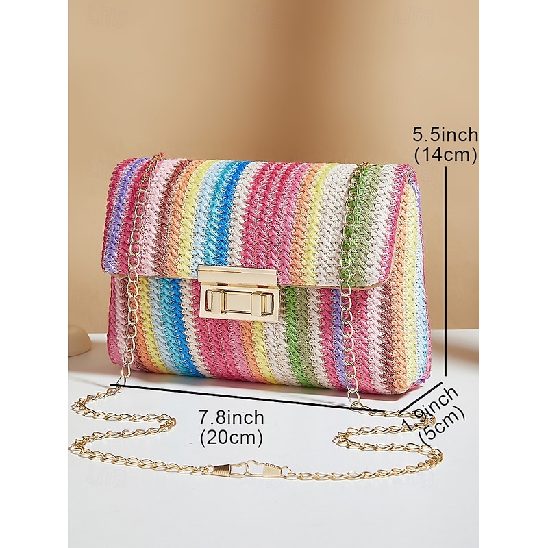trending ! Women's Rainbow Woven Shoulder Bag – Colorful Crochet Crossbody Purse with Gold Chain Strap for Summer, Beach and Vacation Outfits